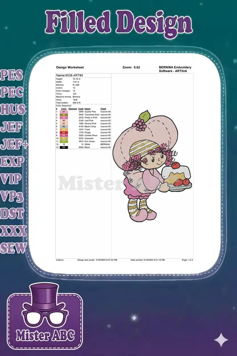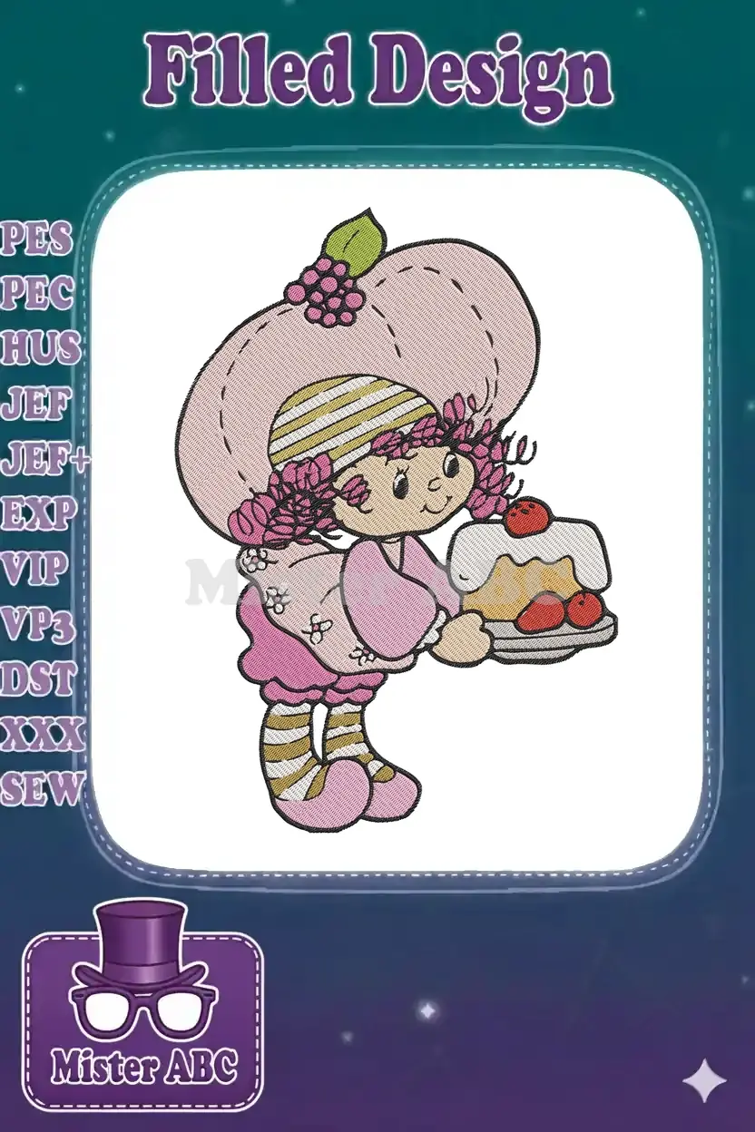 Pink hat girl with berry cake dessert embroidery designs