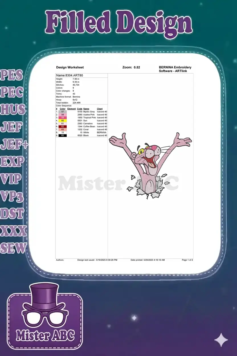 Pink Panther Bursting Through Wall Cartoon Embroidery Designs