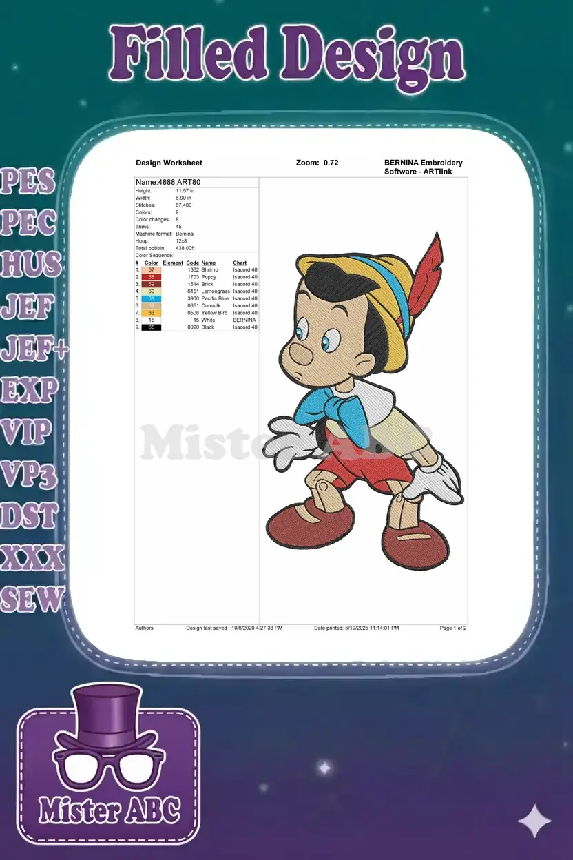 Pinocchio classic cartoon puppet boy embroidery designs with feather hat