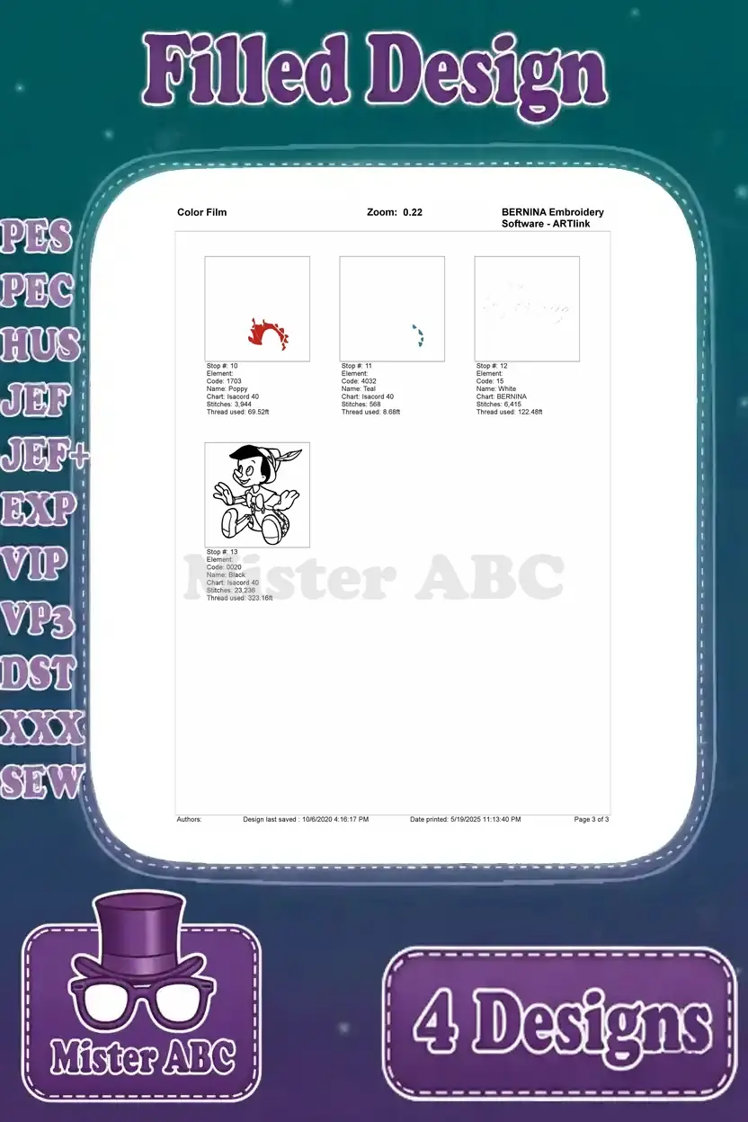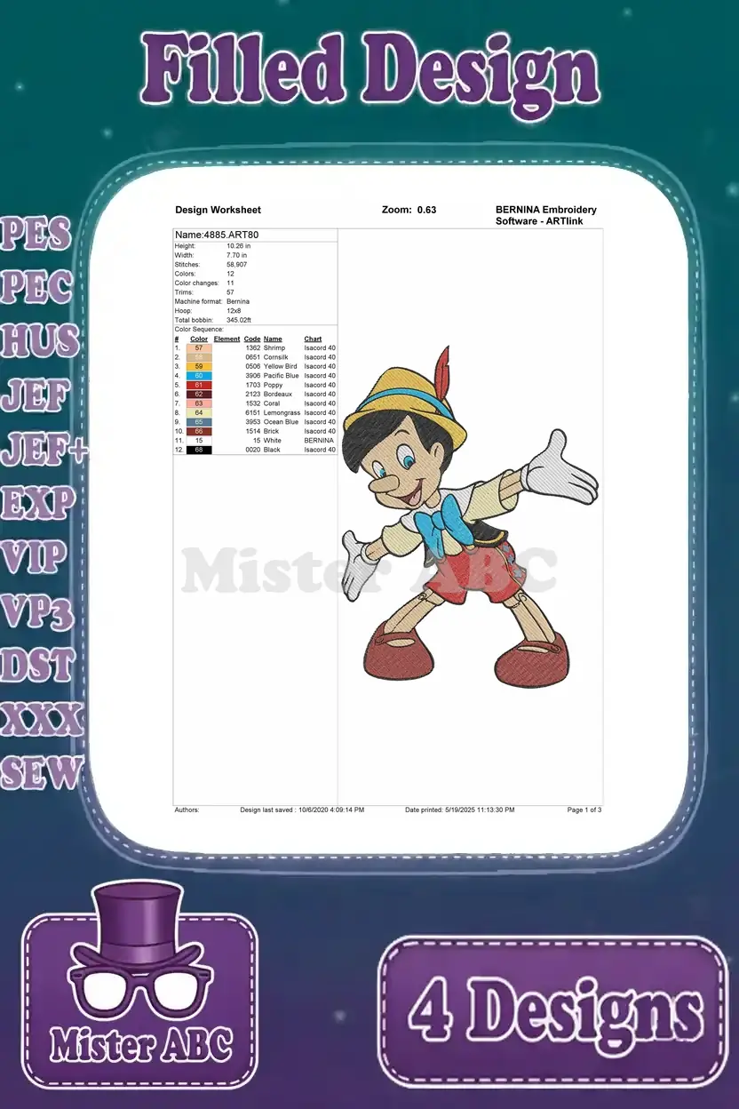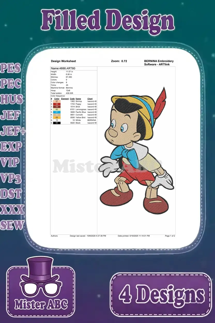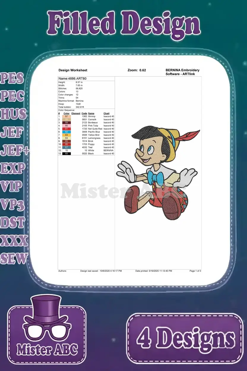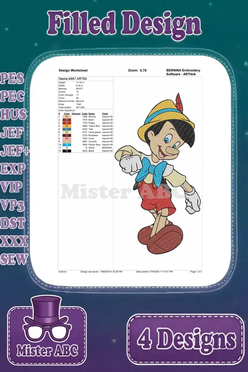 A delightful bundle of four Pinocchio filled embroidery designs, perfect for adding charm to any project.
