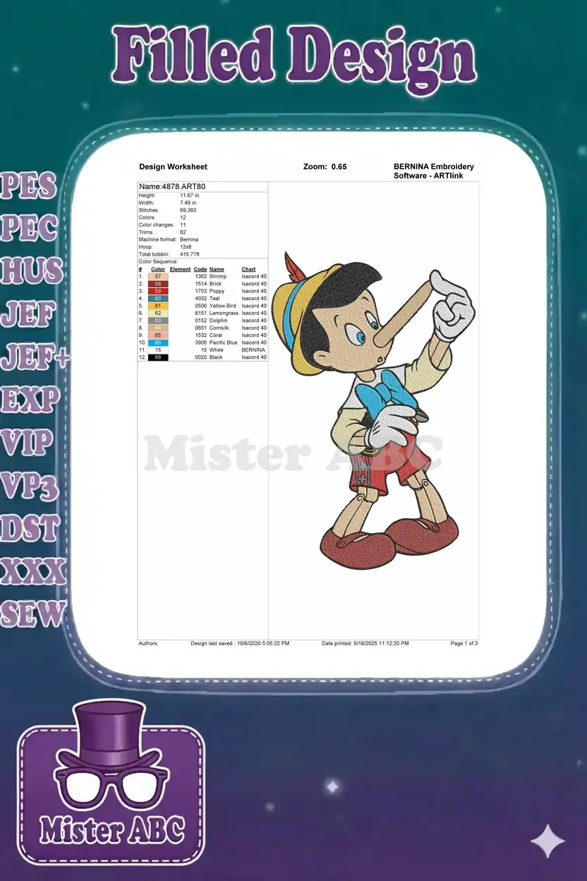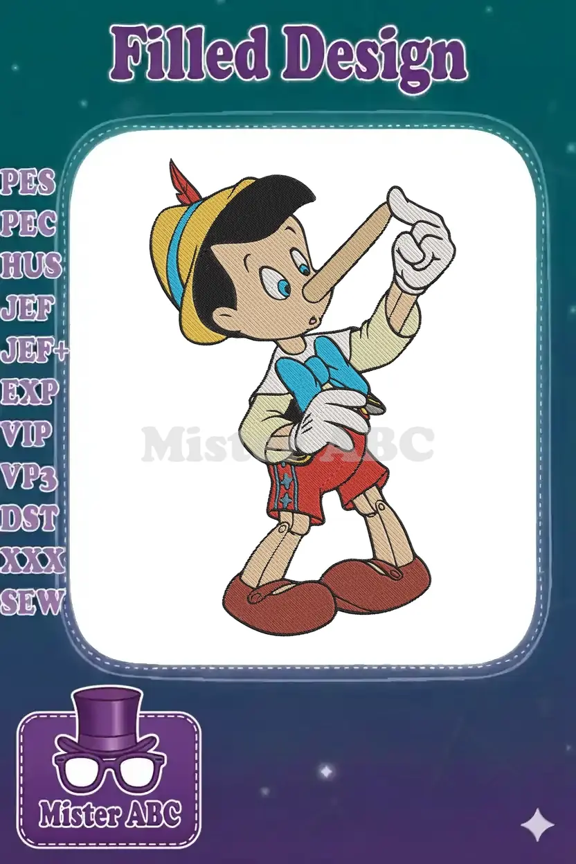 Pinocchio classic wooden puppet long nose cartoon embroidery designs