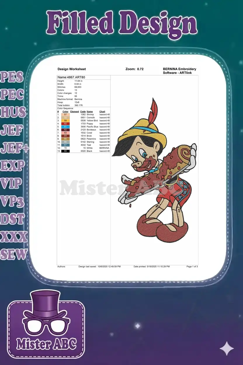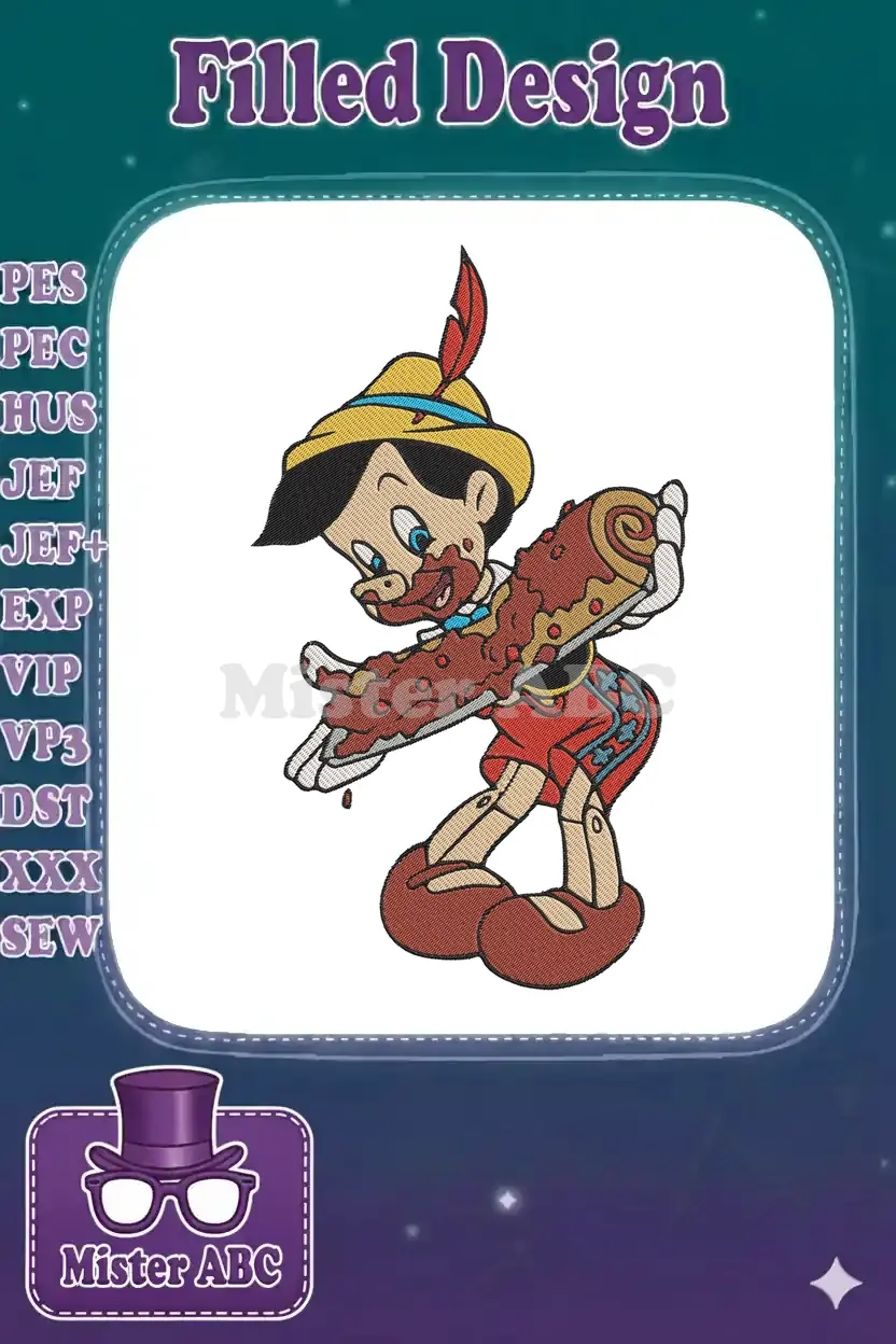 Pinocchio eating chocolate log cake messy cartoon embroidery designs