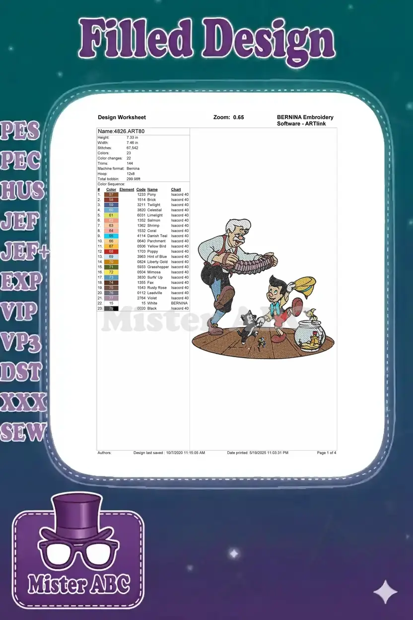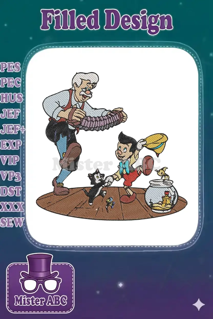 Pinocchio Geppetto Figaro Cleo Jiminy Cricket Disney classic embroidery designs