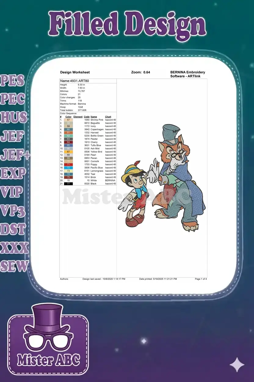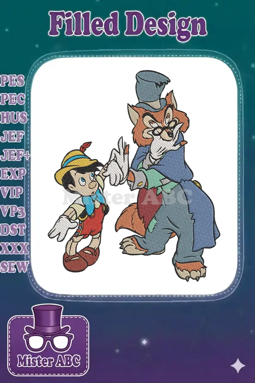 Bring classic Disney charm to life with this vibrant embroidery design featuring Pinocchio and Honest John, perfect for fans.
