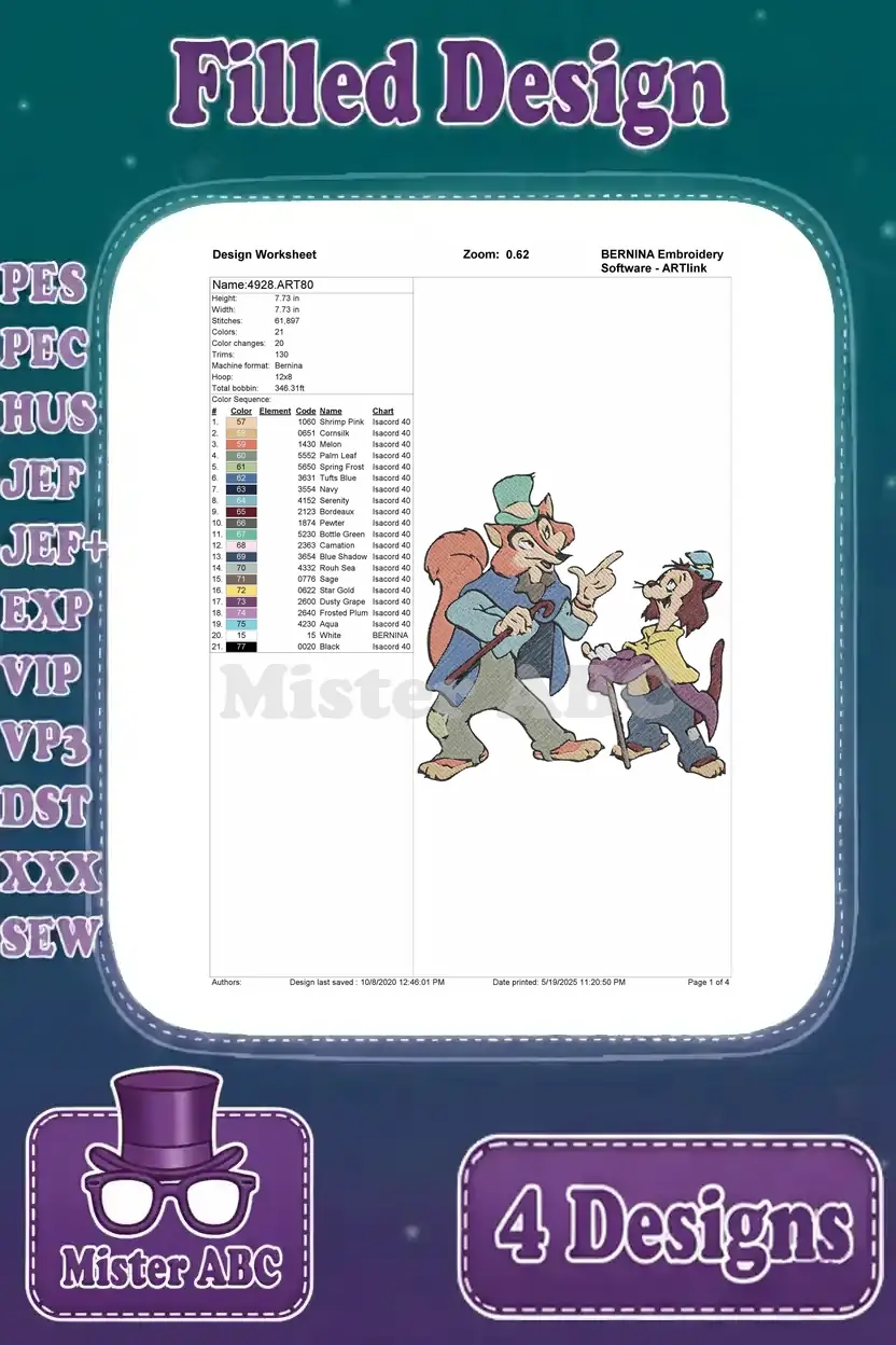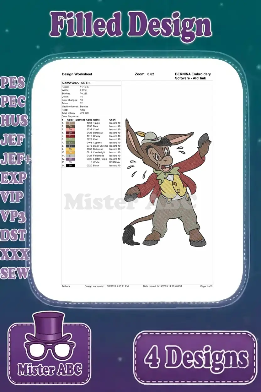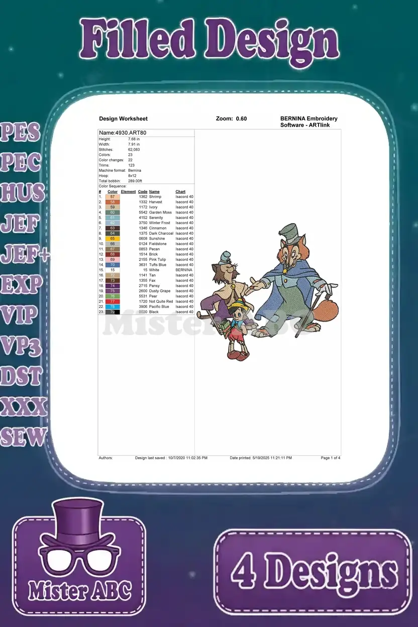 Pinocchio With Honest John The Fox And Gideon The Cat Villainous Duo Scenes – Filled Embroidery Design