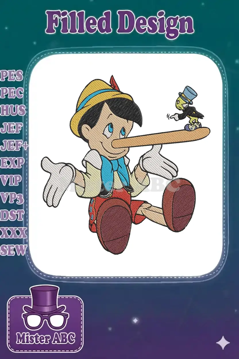 Capture the classic tale with this vibrant Pinocchio and Jiminy Cricket embroidery design. Iconic characters bring nostalgic magic.