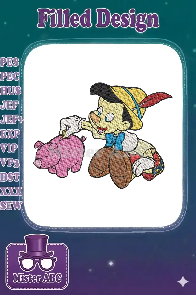 Pinocchio putting gold coin into pink piggy bank embroidery designs