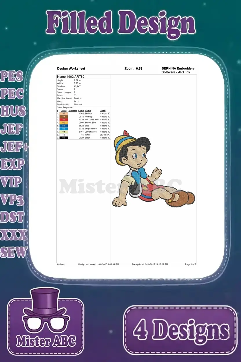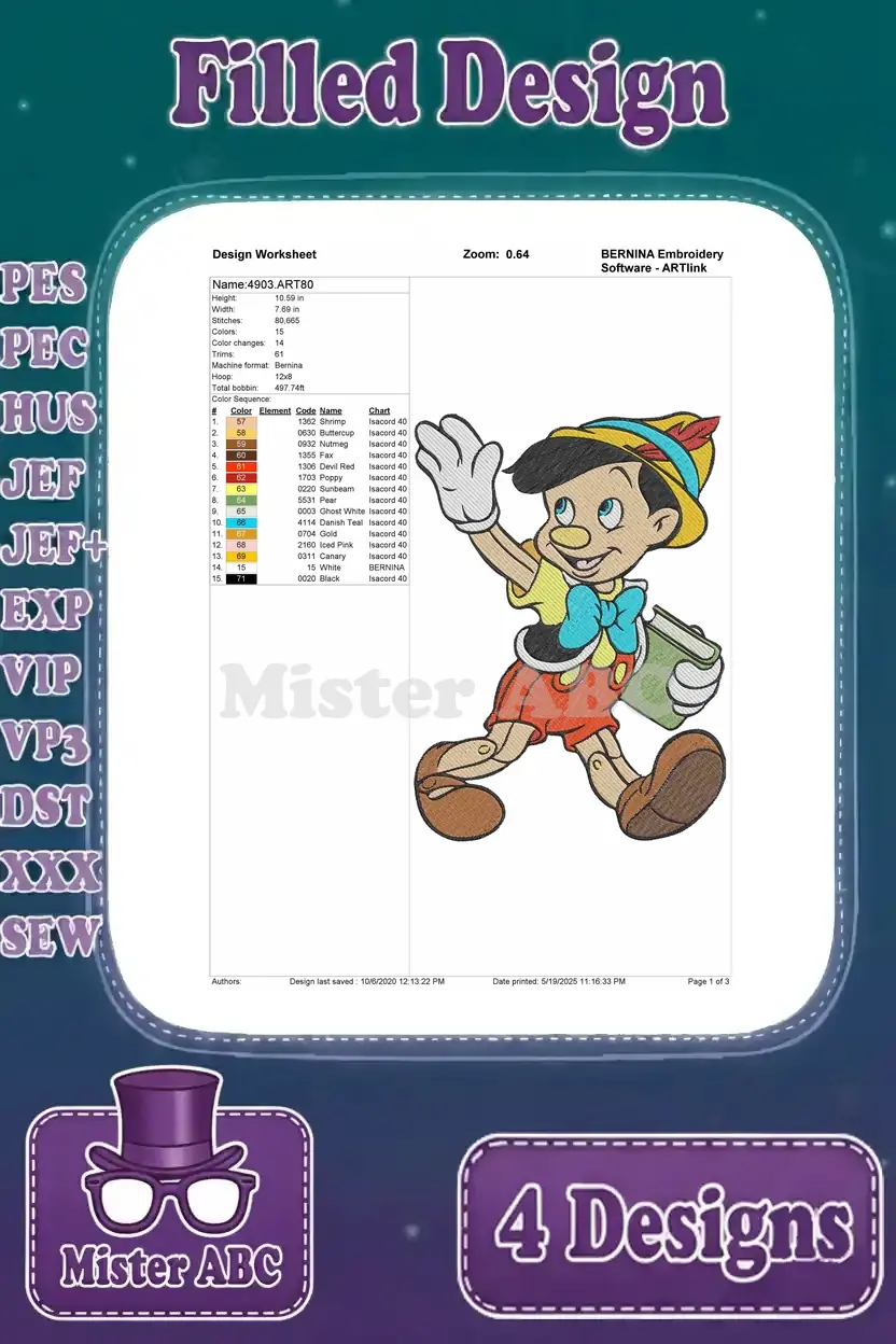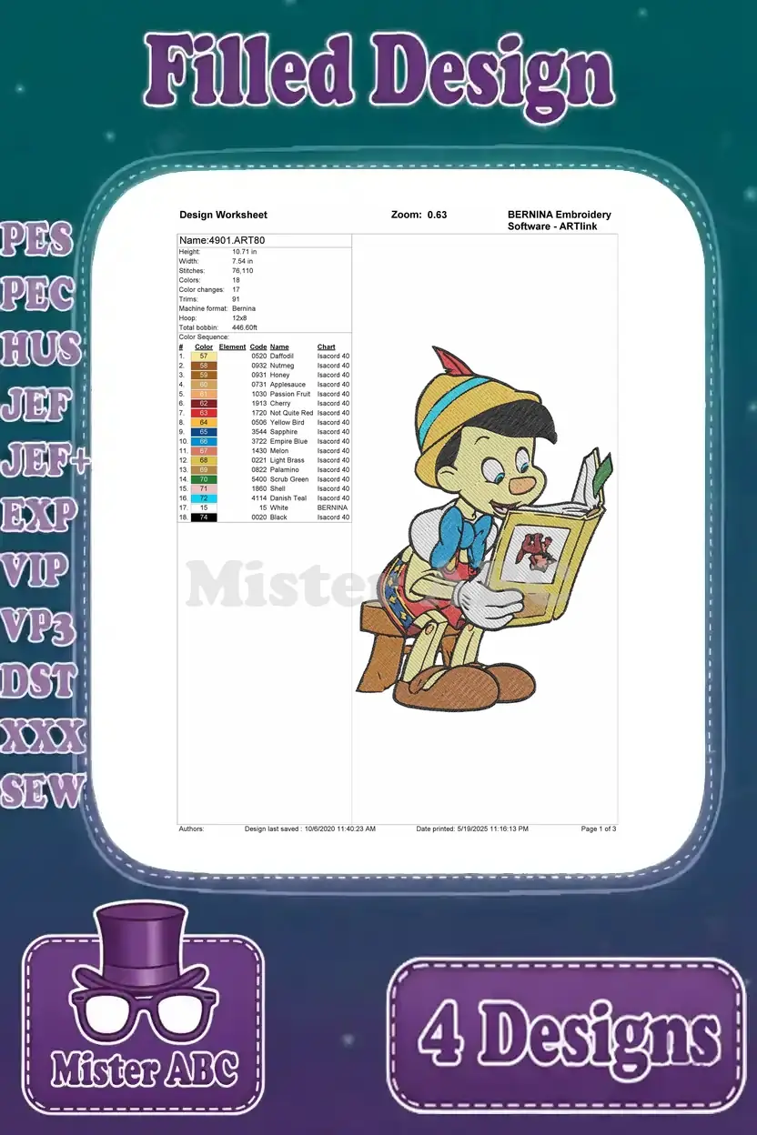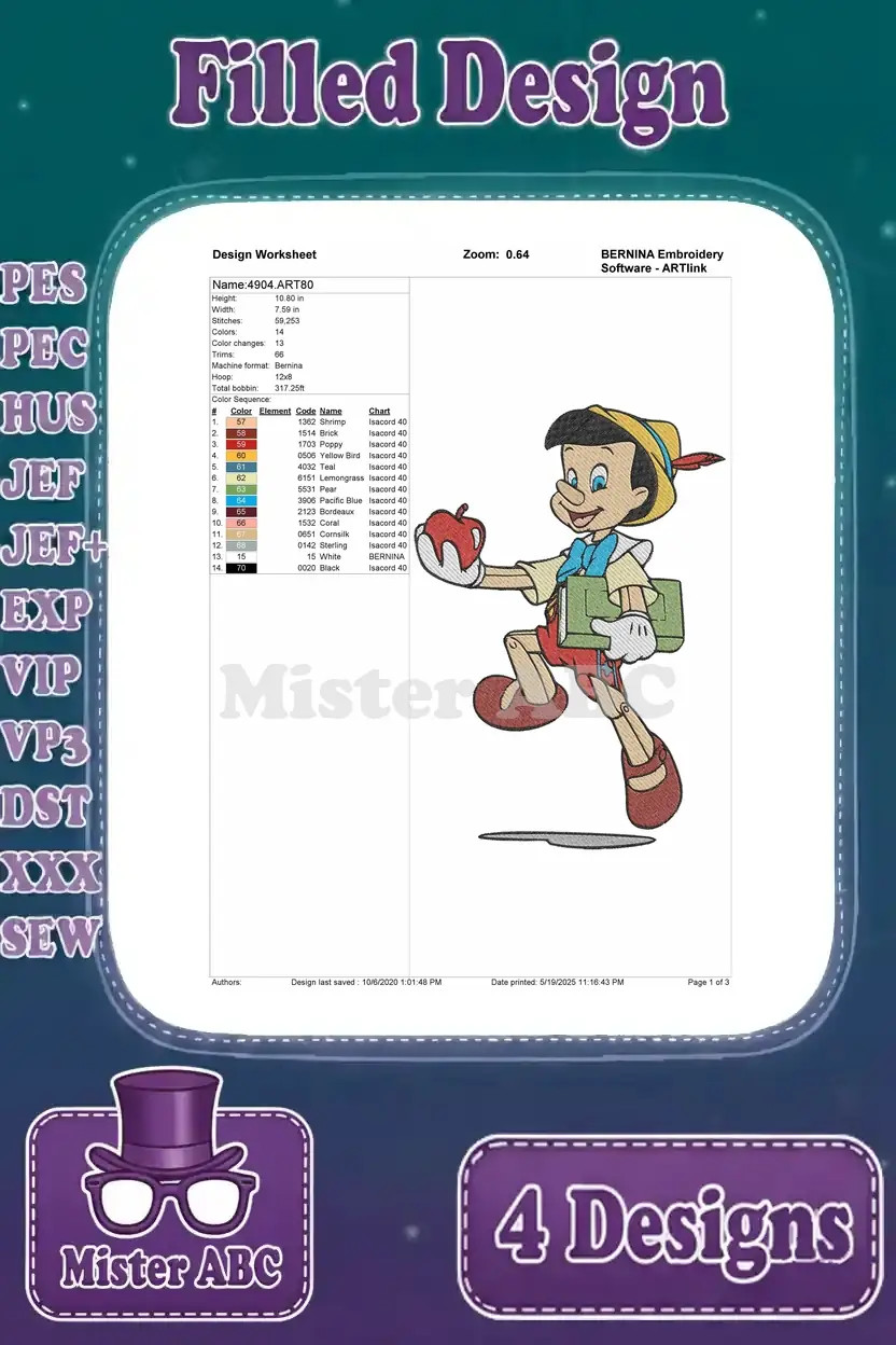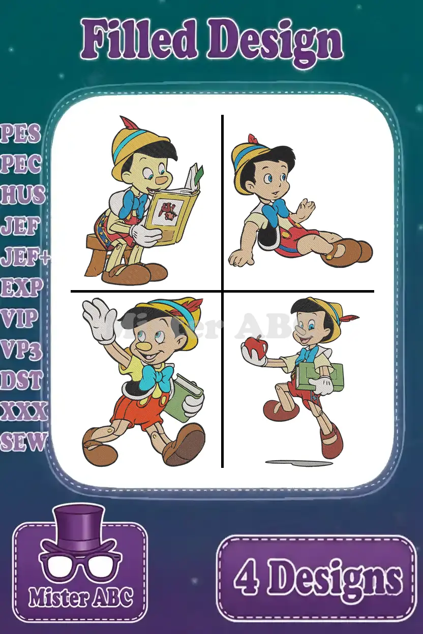 Pinocchio Reading Book Sitting Marching With Apple And Various Boyhood Poses – Filled Embroidery Design