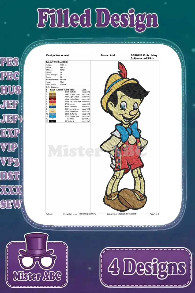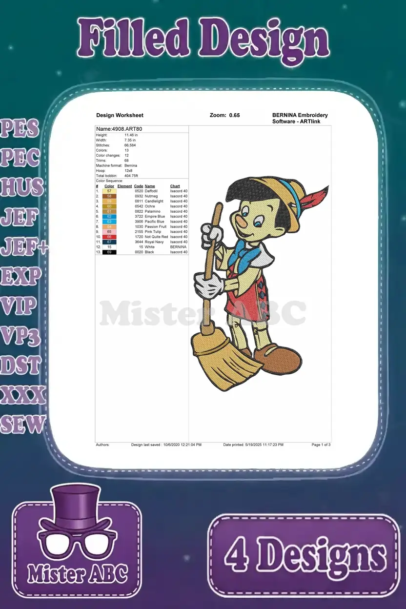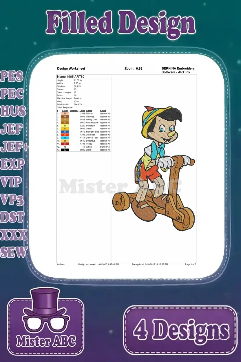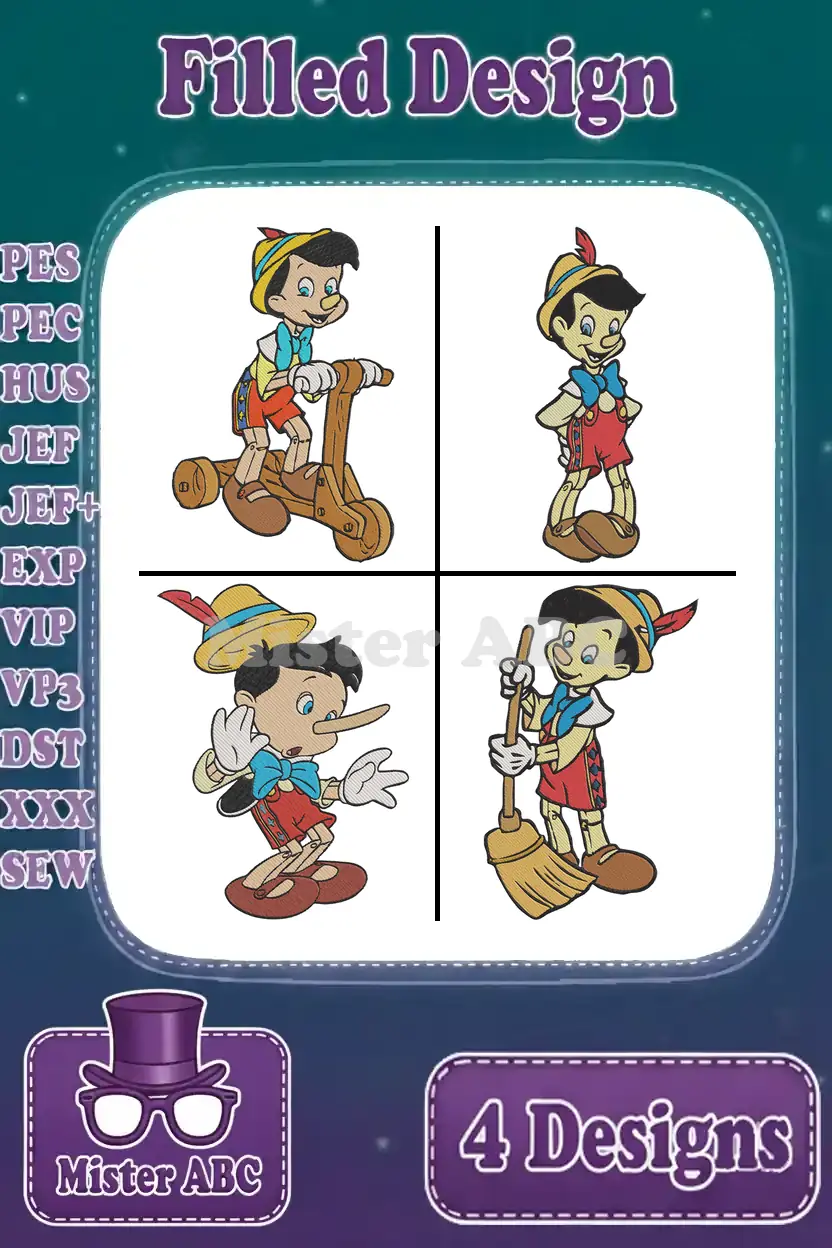 Pinocchio On Scooter Marching With Apple And Other Playful Character Scenes – Filled Embroidery Design