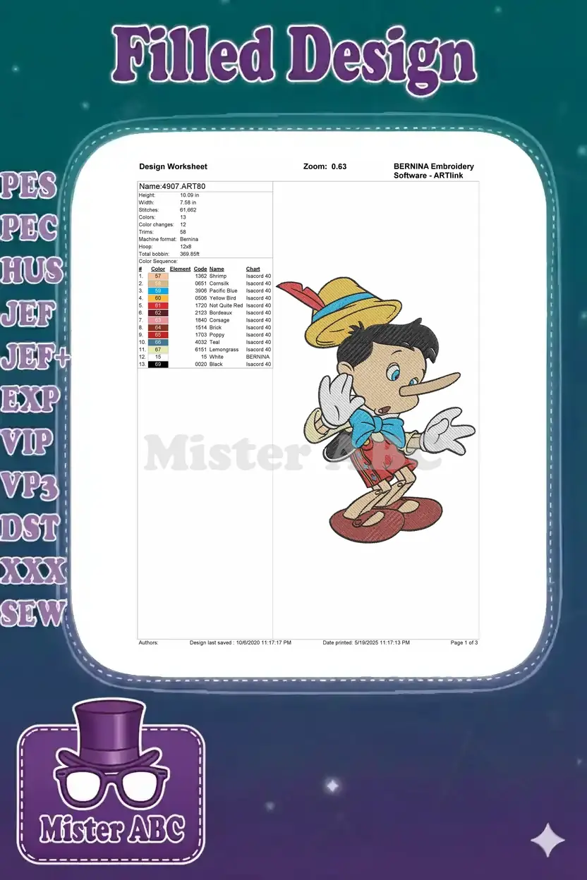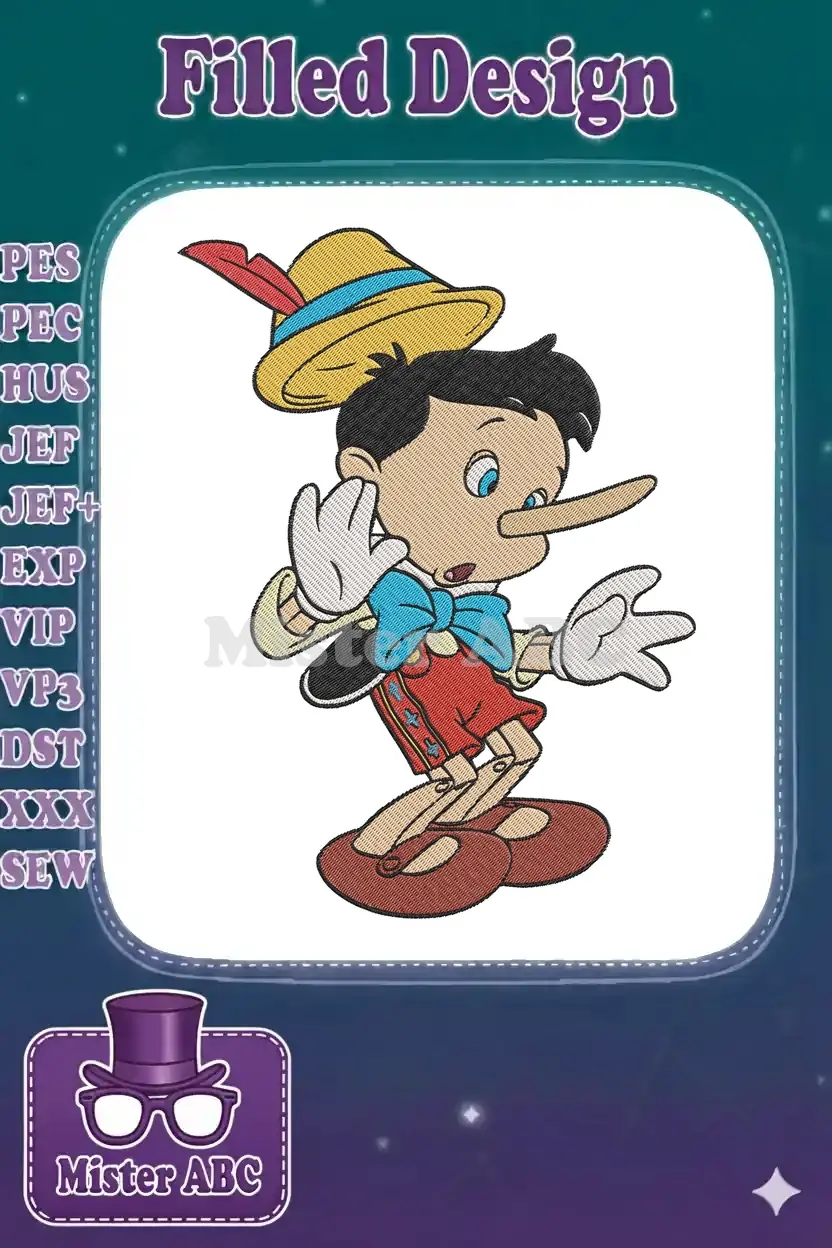 Pinocchio Wooden Puppet Boy Classic Cartoon Embroidery Designs