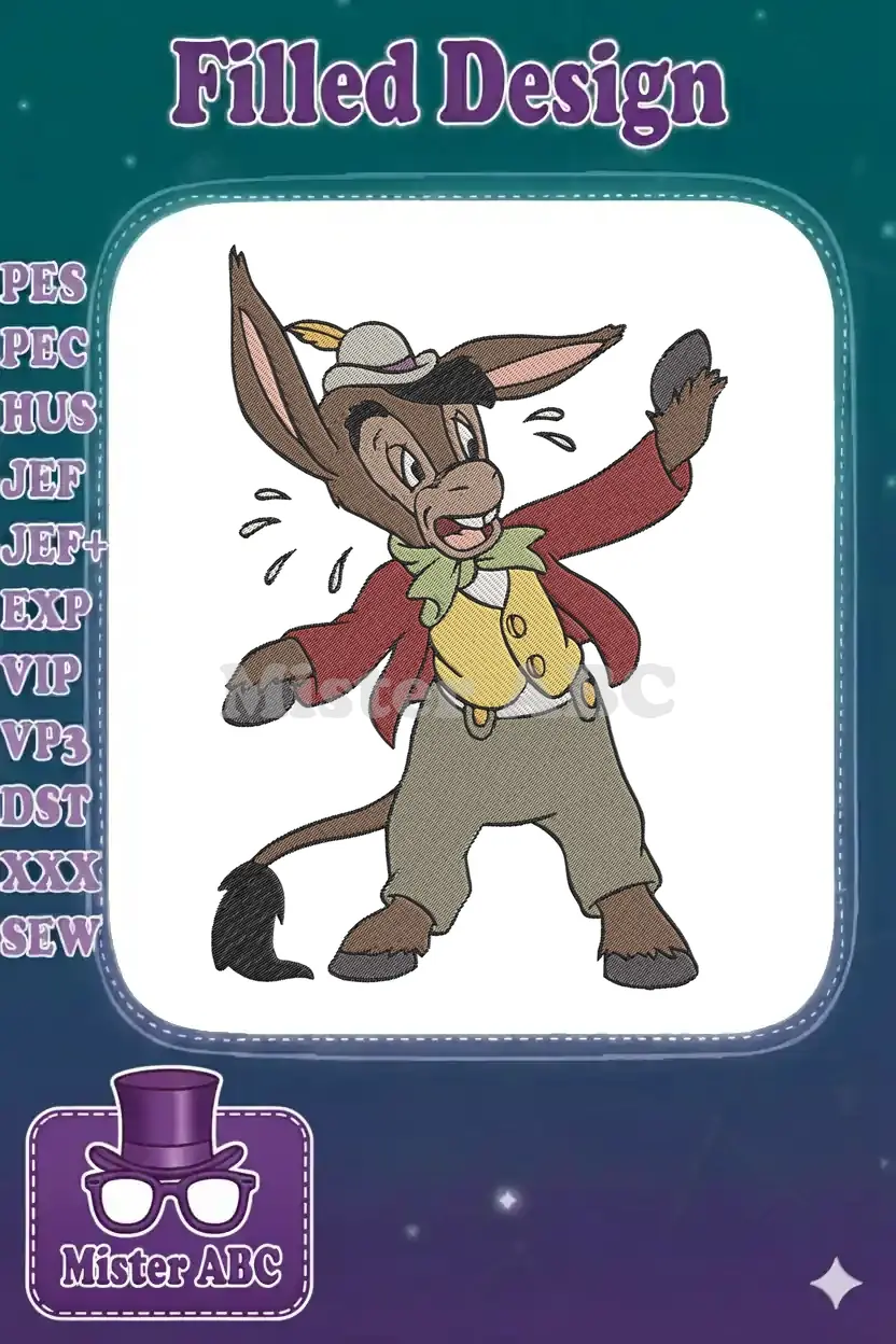 A vibrant embroidery design featuring a classic animated donkey character in a distressed pose. Perfect for fans!