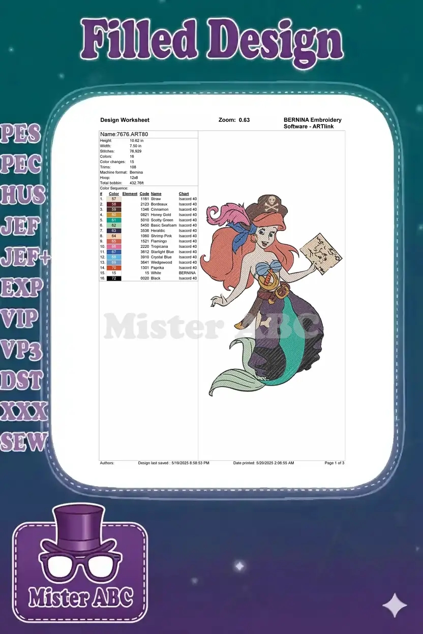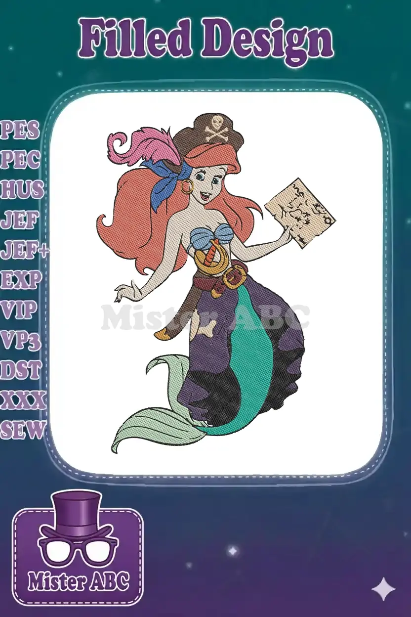 Pirate Mermaid with Treasure Map Embroidery Designs for Kids