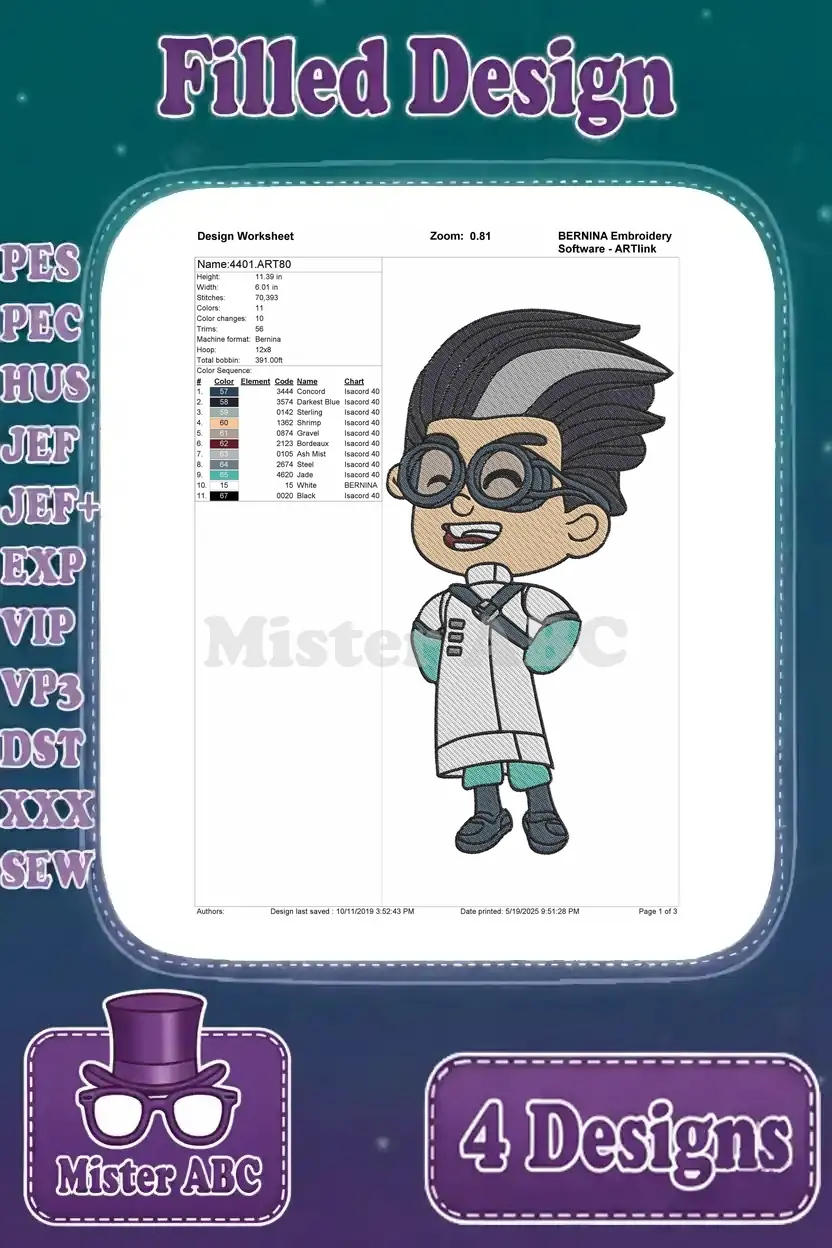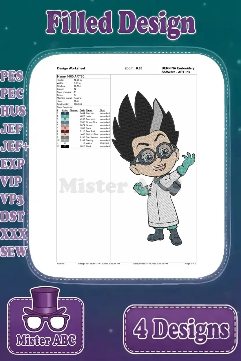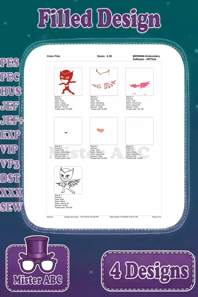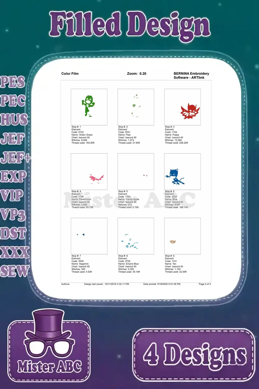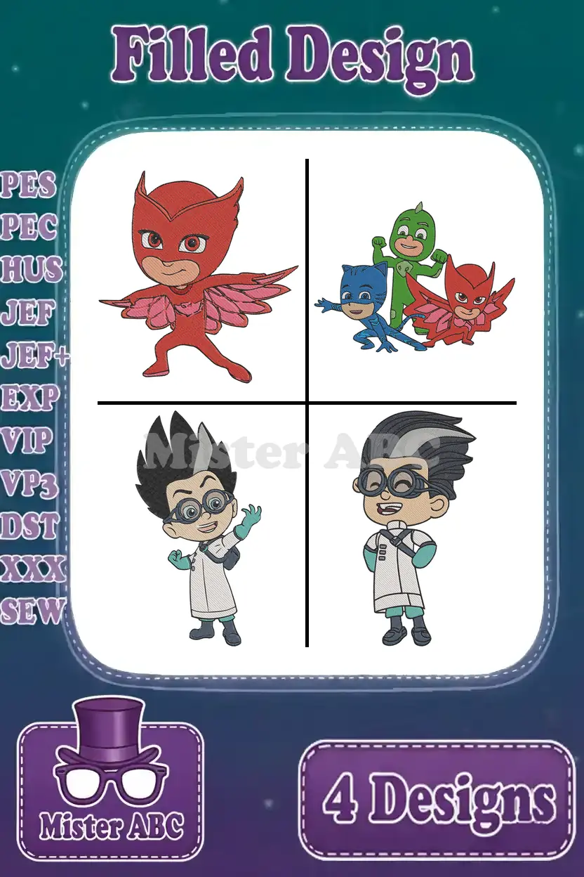 Pj Masks Owlette Catboy Gekko Romeo Mad Scientist Villain Heroes Group Collection – Filled Embroidery Design