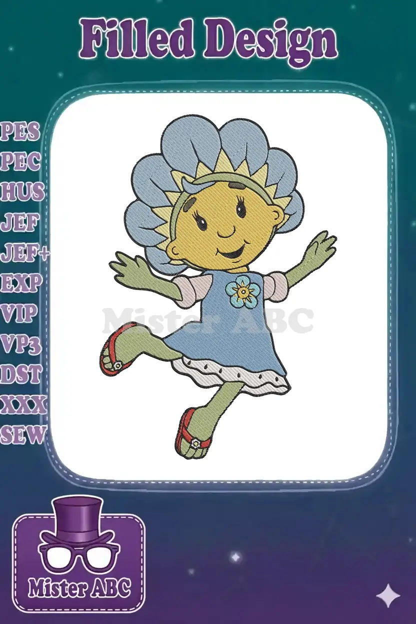 Playful cartoon flower girl dancing in blue dress embroidery designs