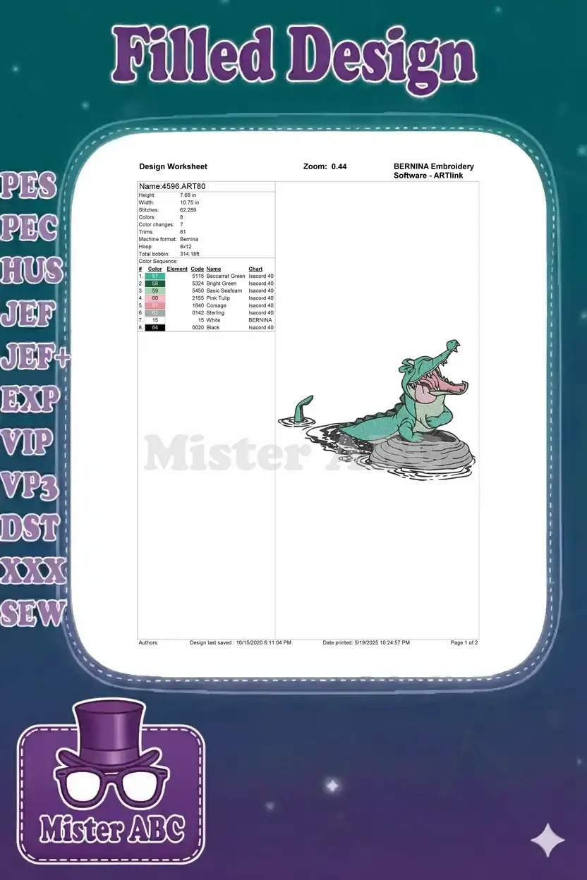 Playful cartoon green alligator yawning on rock embroidery designs