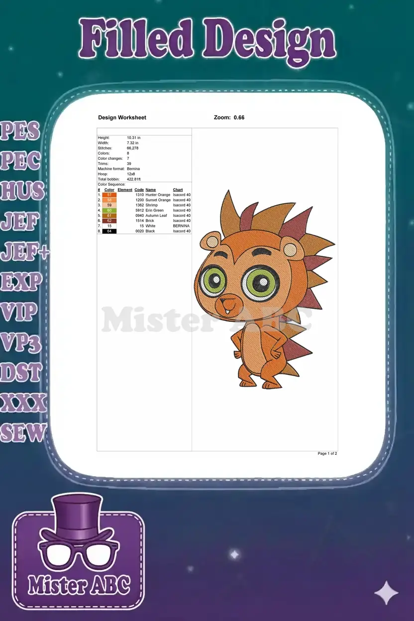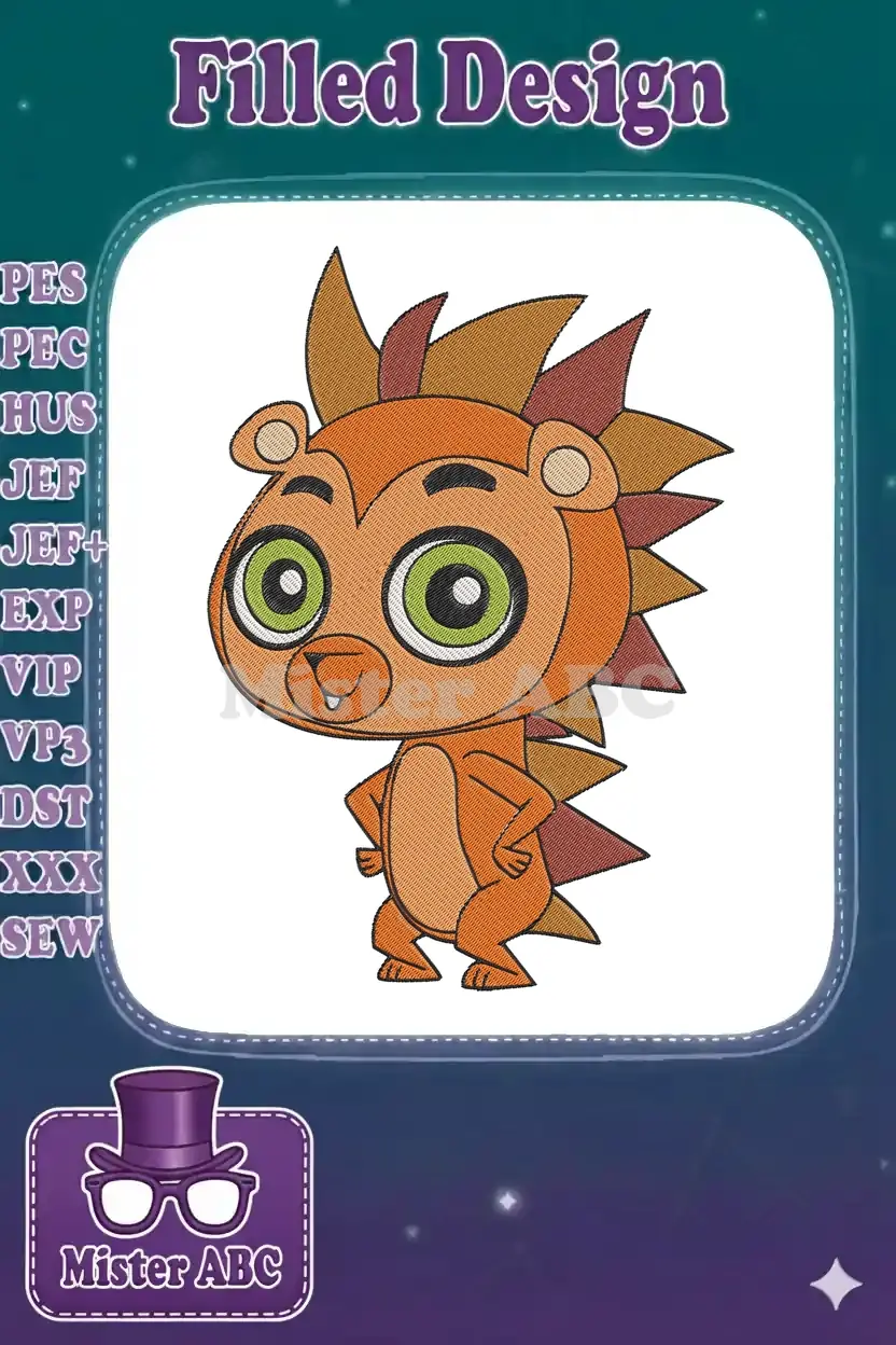 Playful cartoon orange hedgehog with green eyes embroidery designs