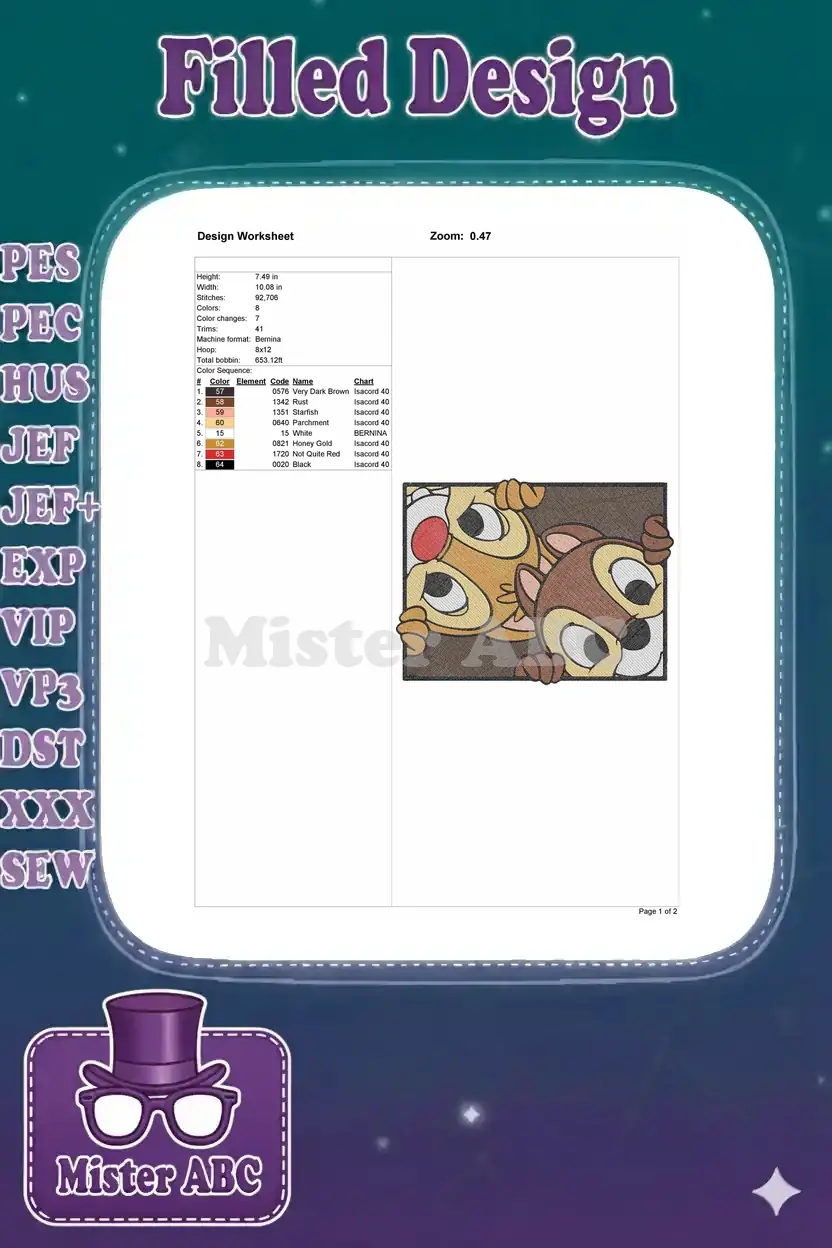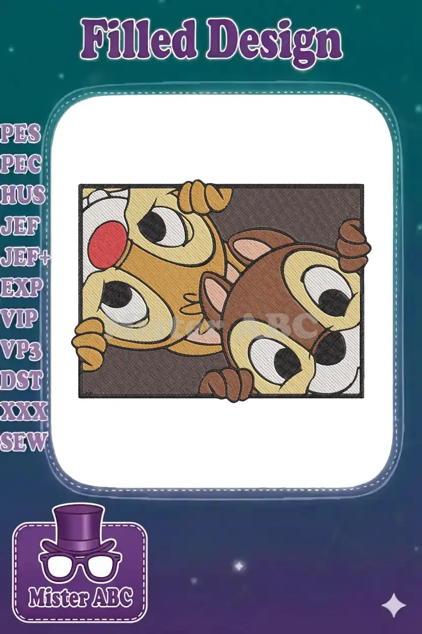 A charming embroidery design featuring Chip and Dale playfully peeking out, perfect for adding a fun, mischievous touch to any project. Capture their iconic personalities with this delightful digital pattern.