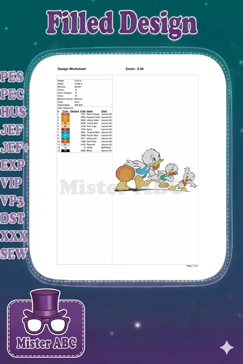 Playful Donald Duck and Nephews Basketball Game Embroidery Designs