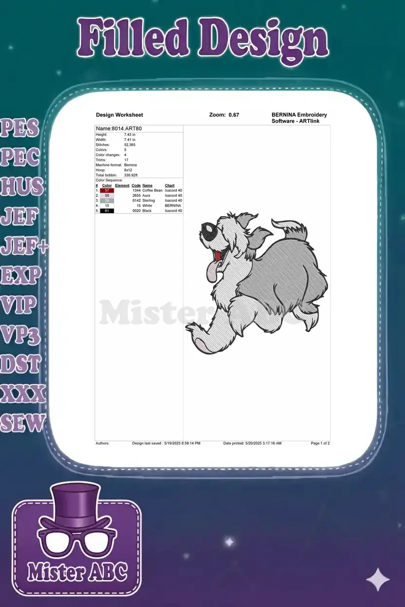 A lively embroidery design featuring a playful, shaggy dog, perfect for adding a touch of animated charm to any item.