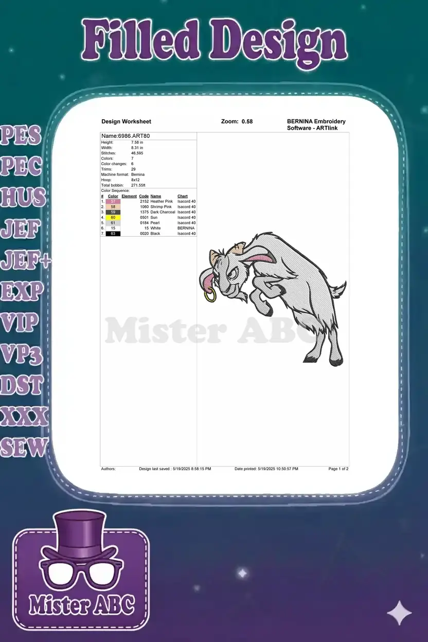 Playful Jumping Gray Goat with Nose Ring Embroidery Designs