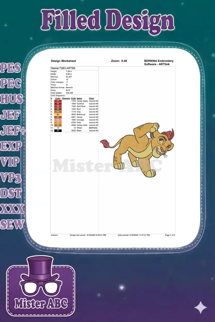 Bring the adventurous spirit of Kion from The Lion Guard to life with this vibrant embroidery design, perfect for fans of all ages!