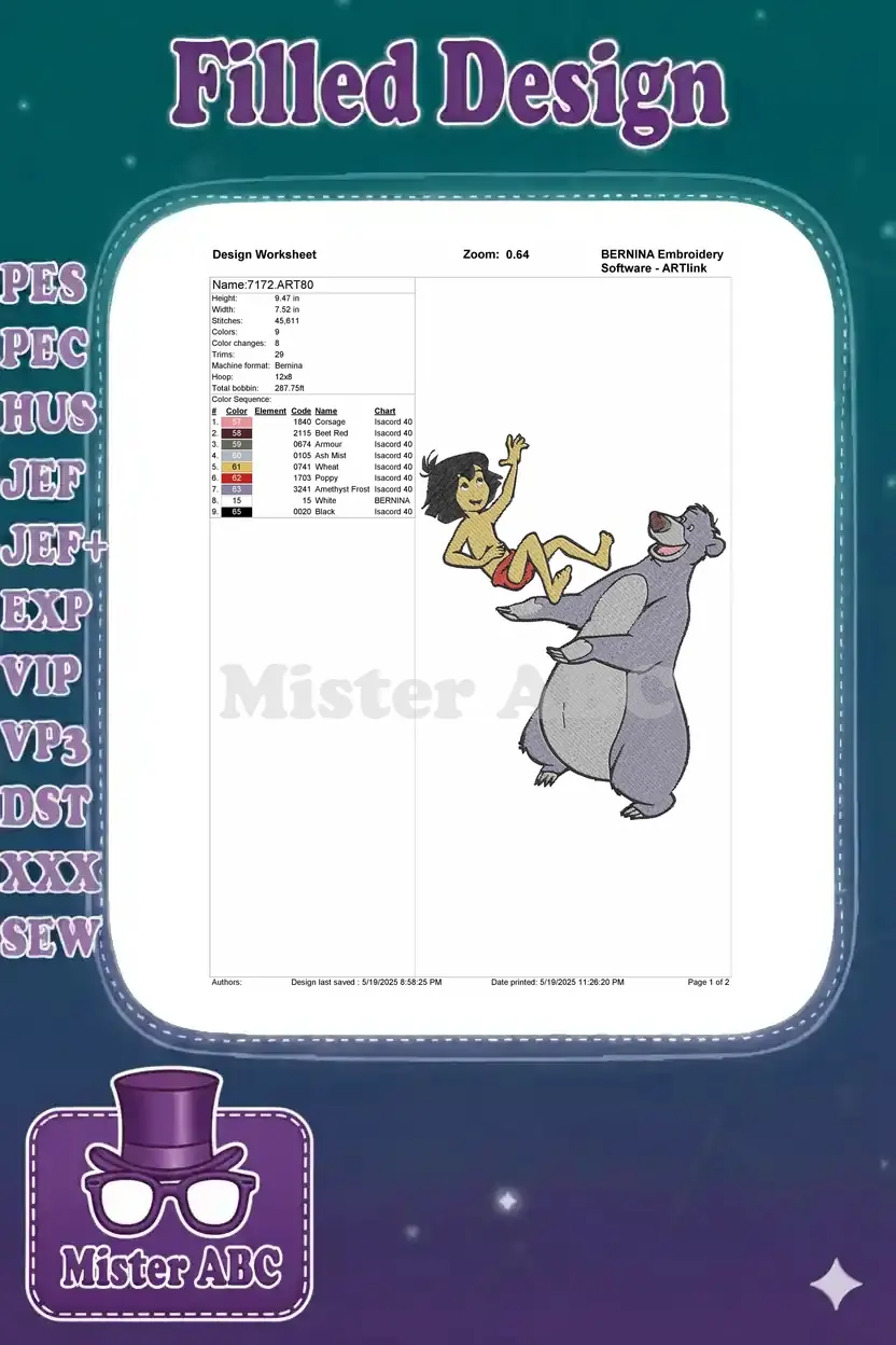 Playful Mowgli and Baloo Bear Jungle Book Embroidery Designs