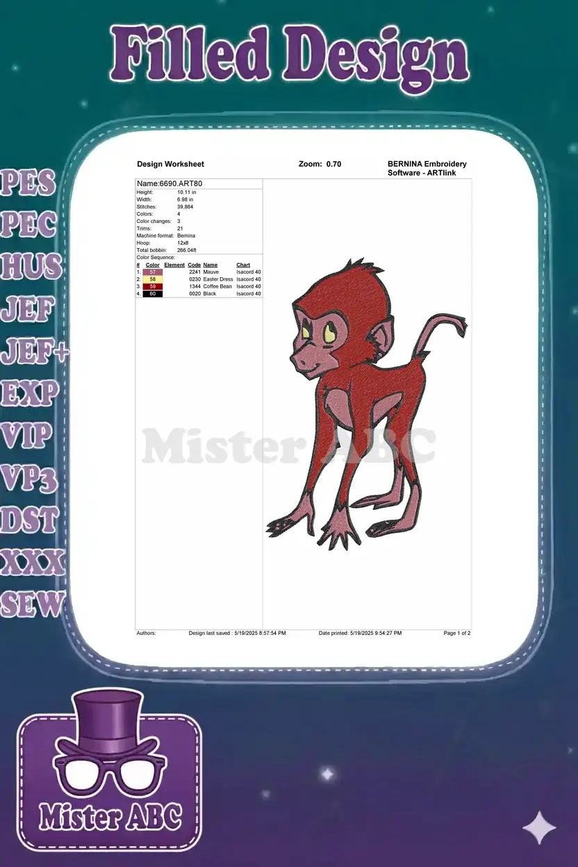 Playful Red Cartoon Baboon Monkey Character Embroidery Designs