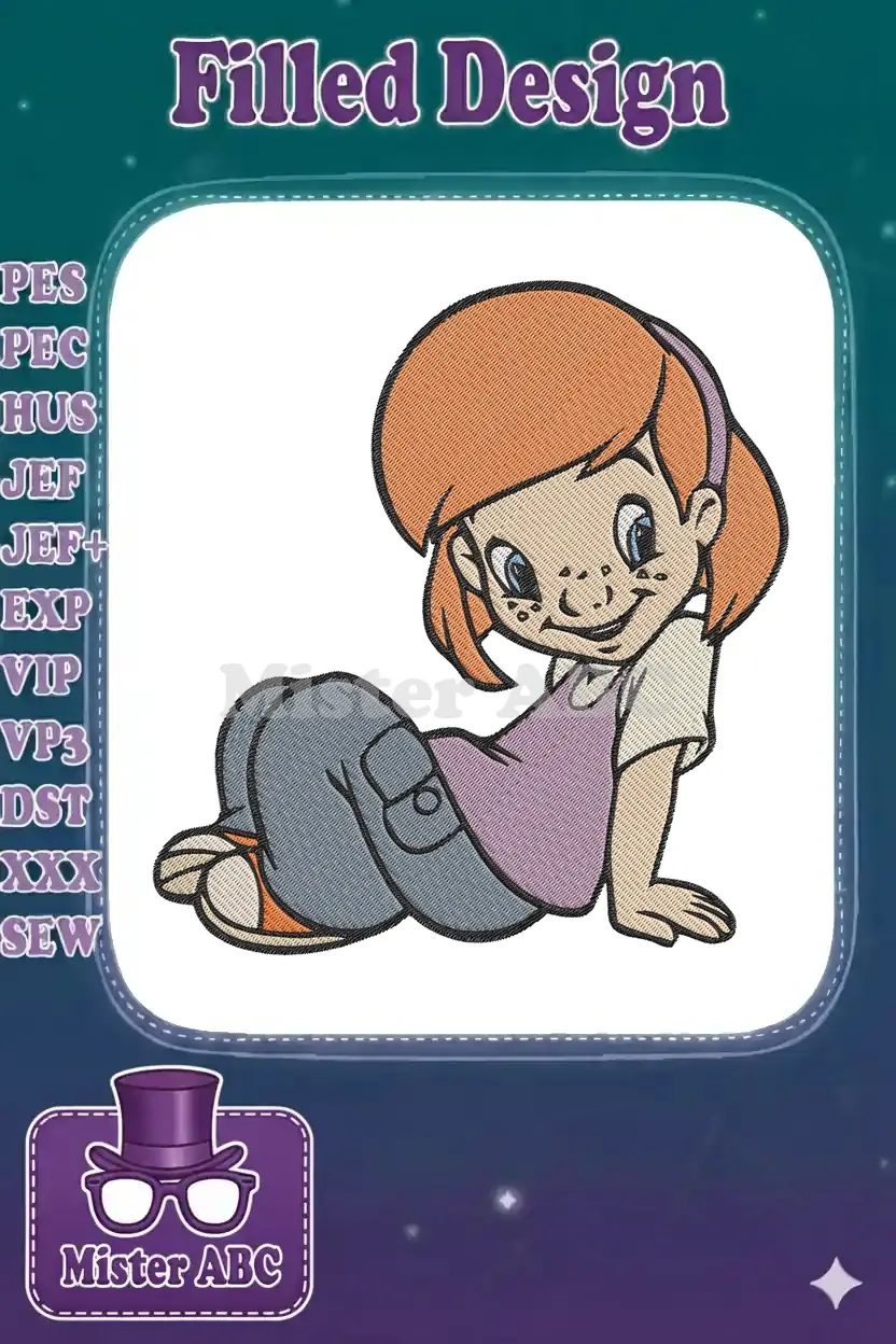 Playful red-haired cartoon girl sitting happy embroidery designs
