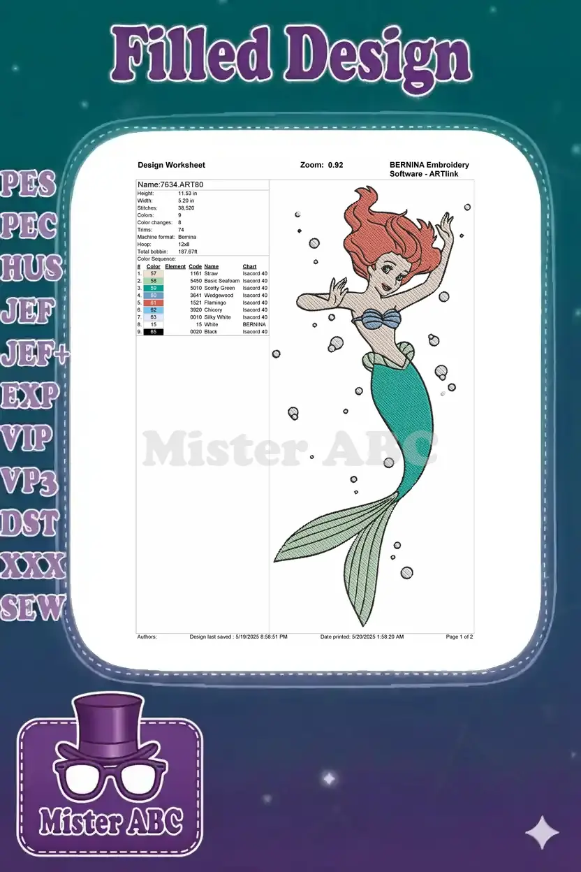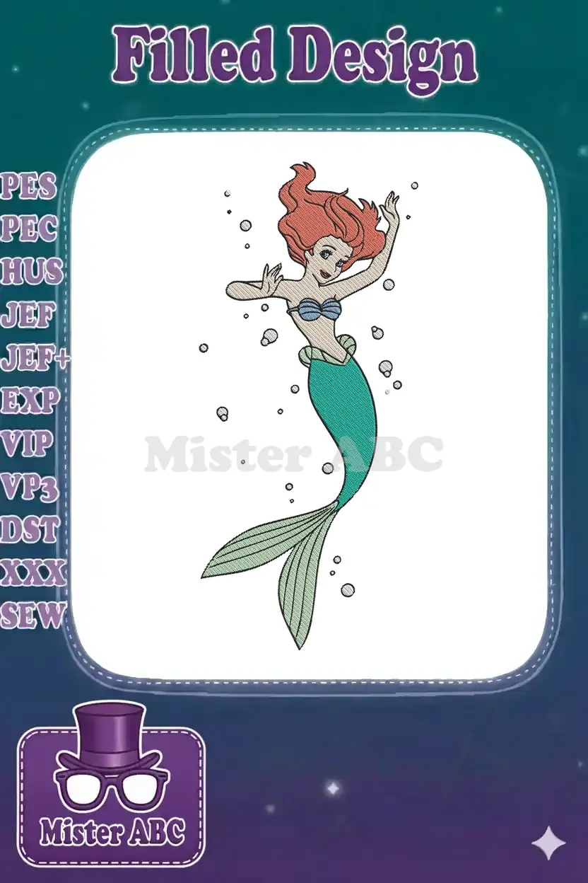 Playful red-haired mermaid swimming with bubbles embroidery designs