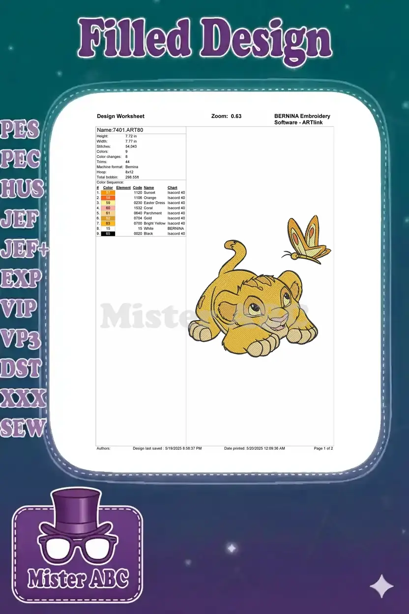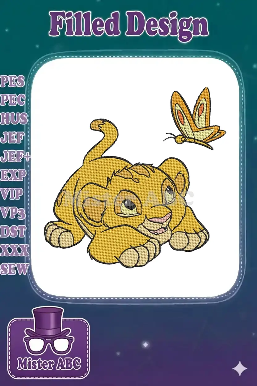Playful Simba lion cub and butterfly embroidery designs