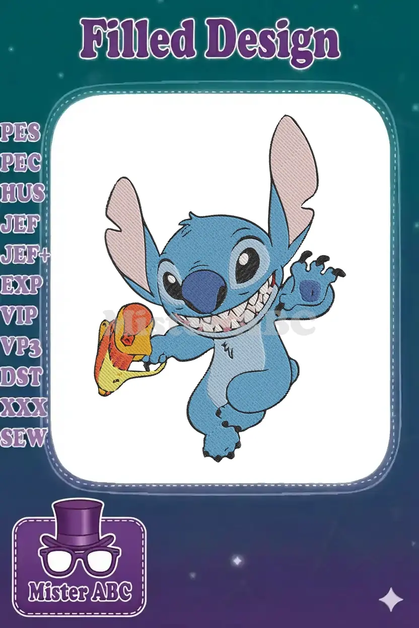 Playful Stitch alien holding a yellow orange toy embroidery designs