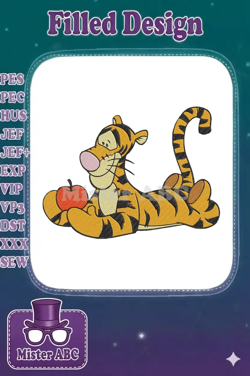 Playful Tigger character lying down holding a red apple embroidery designs