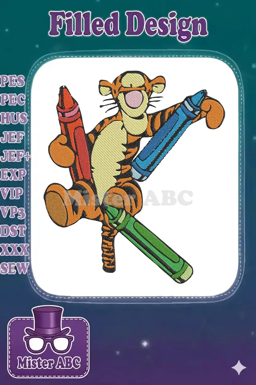 Playful Tigger holding red blue green crayons embroidery designs