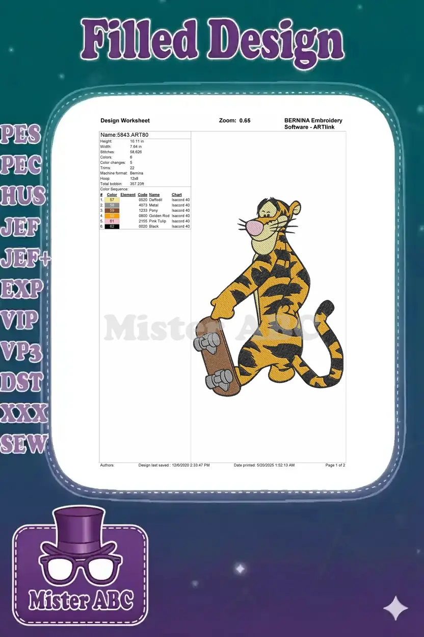 Playful Tigger Skateboard Fun Cartoon Character Embroidery Designs