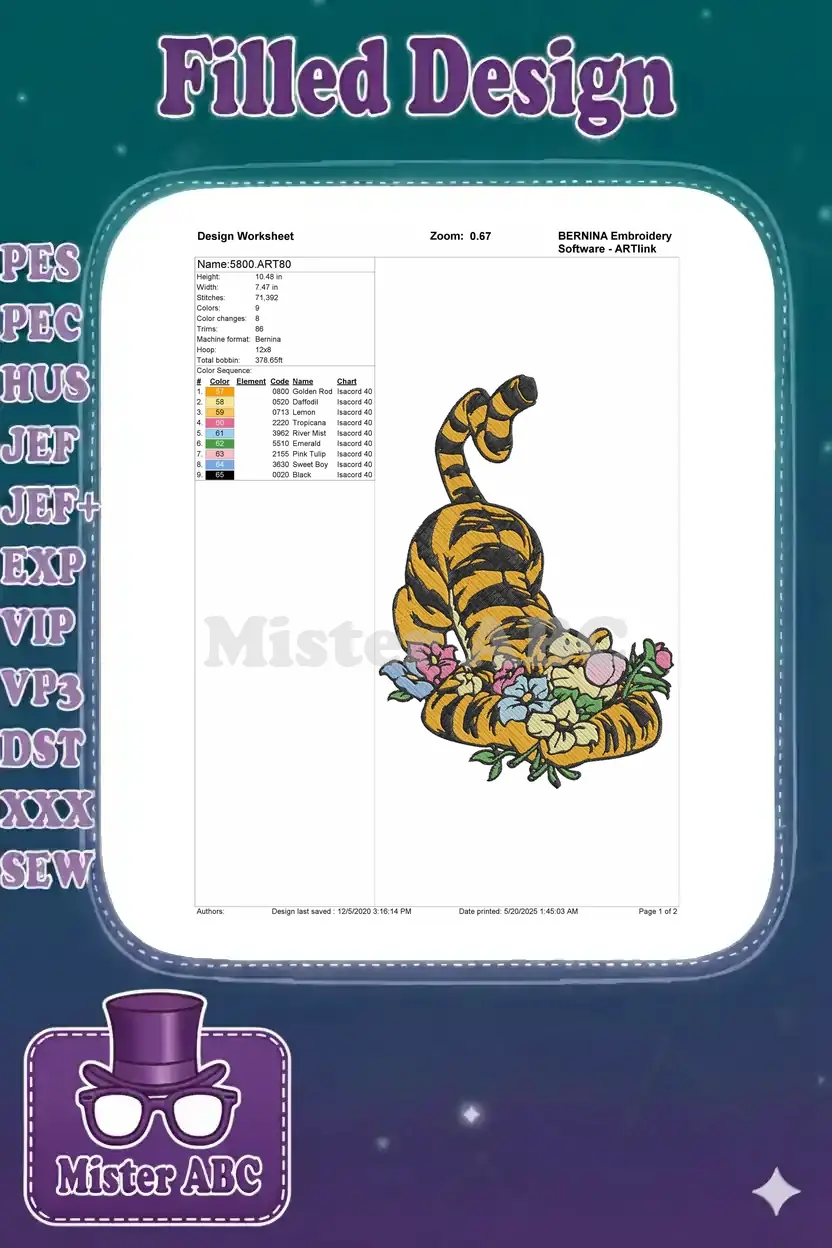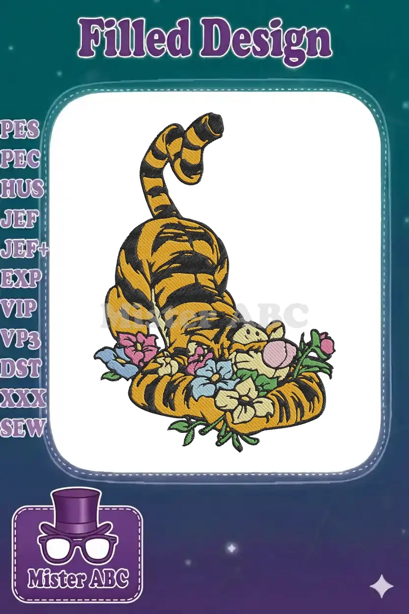 Playful Tigger Stretching Among Vibrant Flowers Embroidery Designs