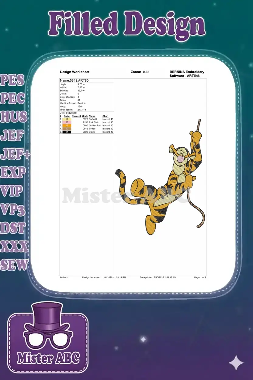 Playful Tigger Swinging on Rope Cartoon Embroidery Designs