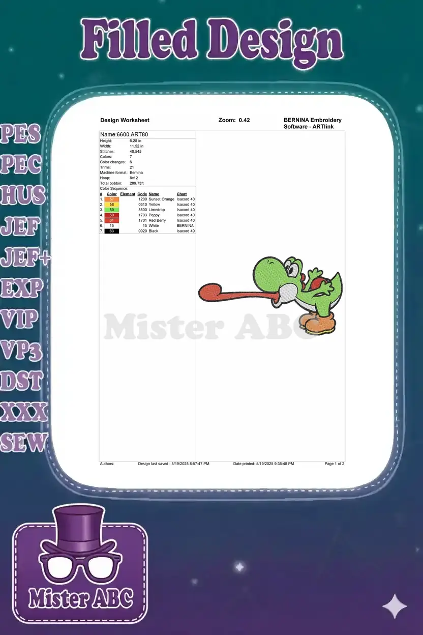 Playful Yoshi green dinosaur sticking out tongue embroidery designs