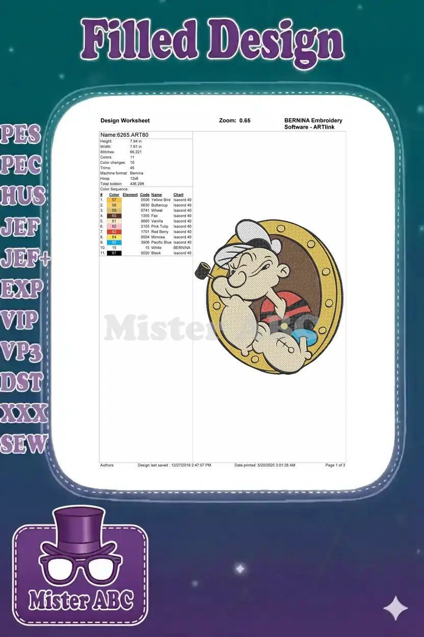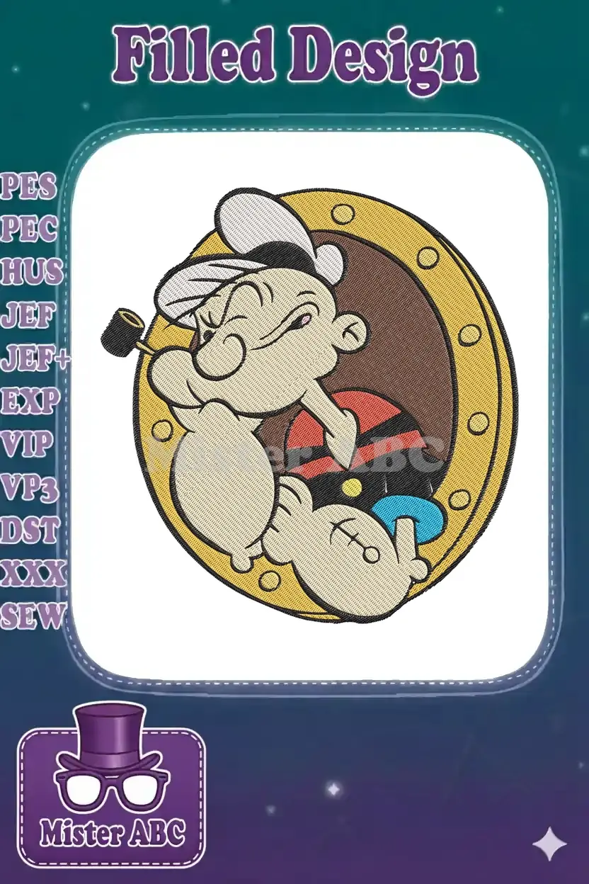 Popeye the Sailor Man cartoon character porthole embroidery designs