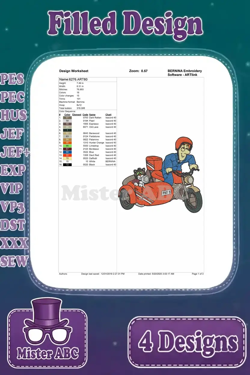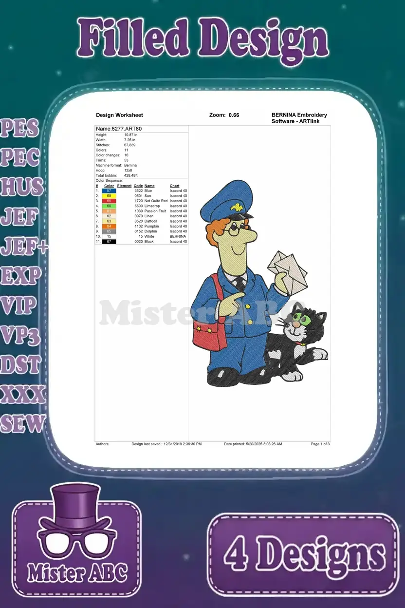 Postman Pat With Jess The Cat Delivering Mail Van Helicopter Greendale Set – Filled Embroidery Design