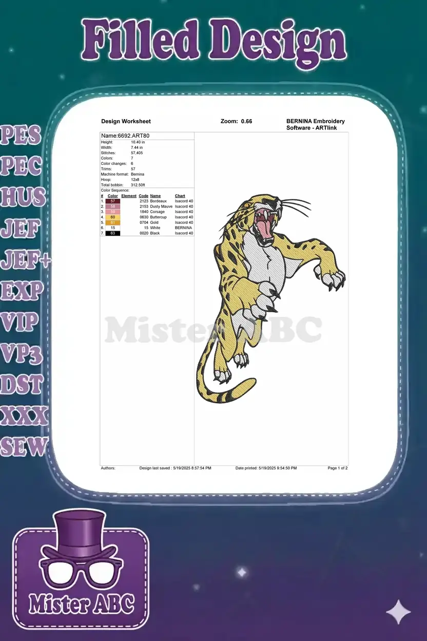 Dynamic leaping jaguar embroidery design, perfect for fierce apparel. Unleash wild style with this powerful stitched motif.