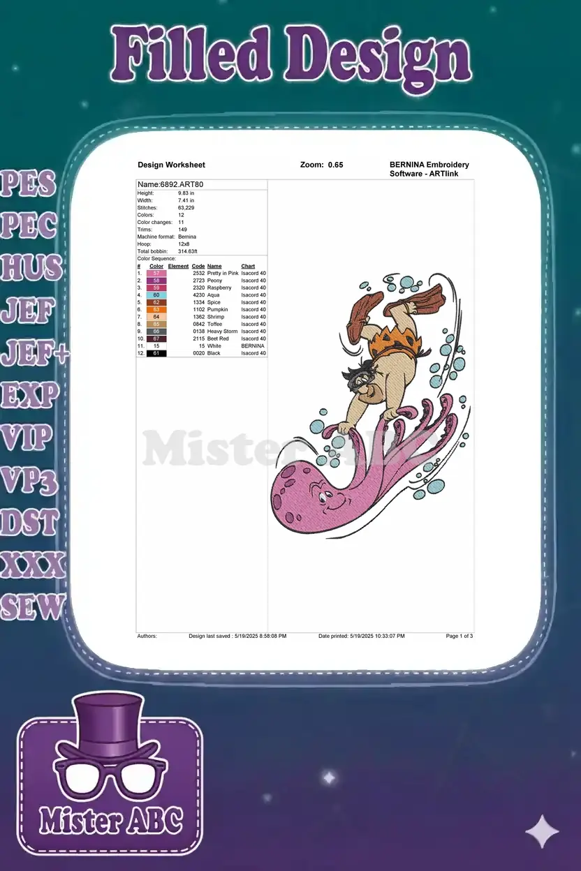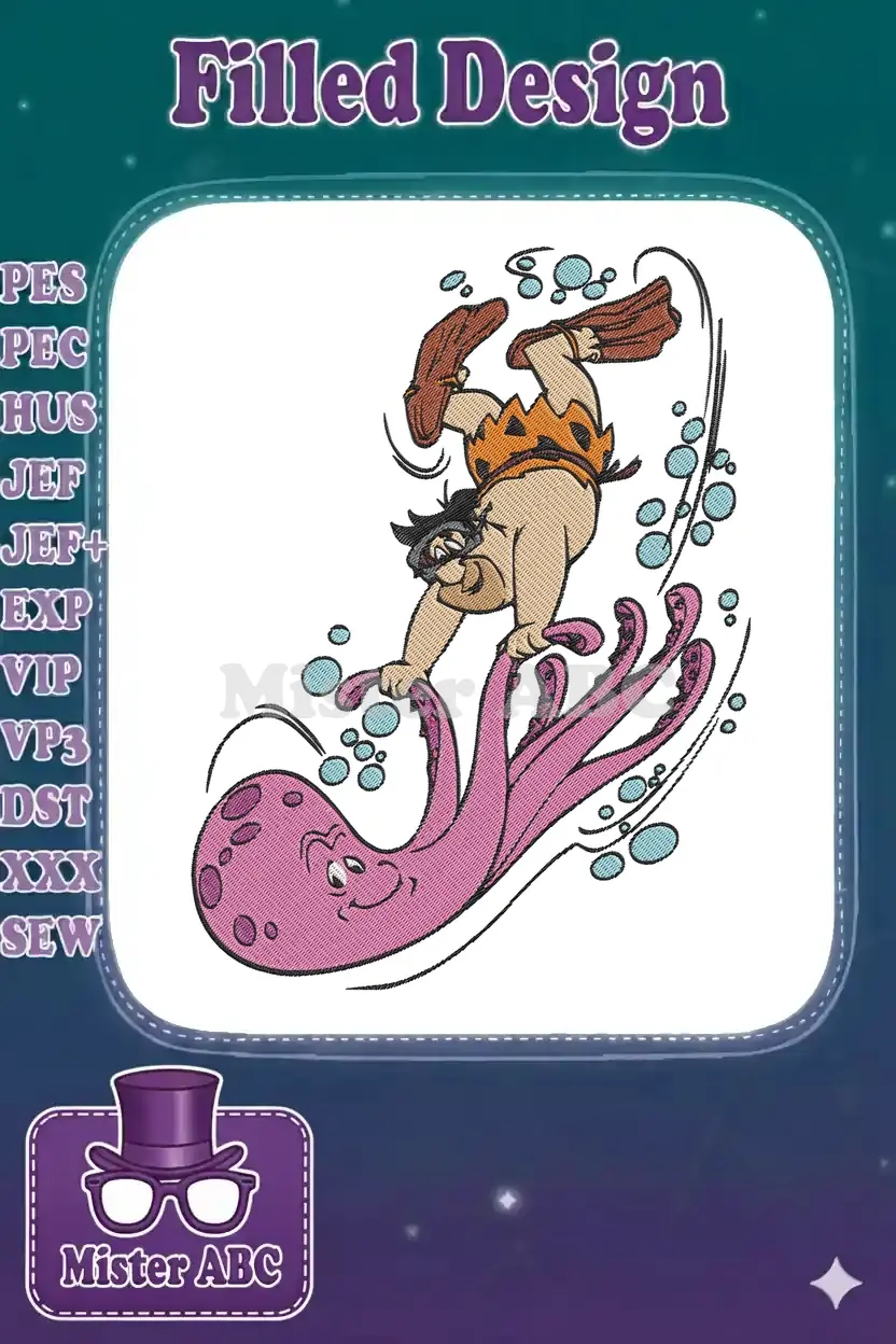 Prehistoric cartoon diver and smiling pink octopus underwater embroidery designs