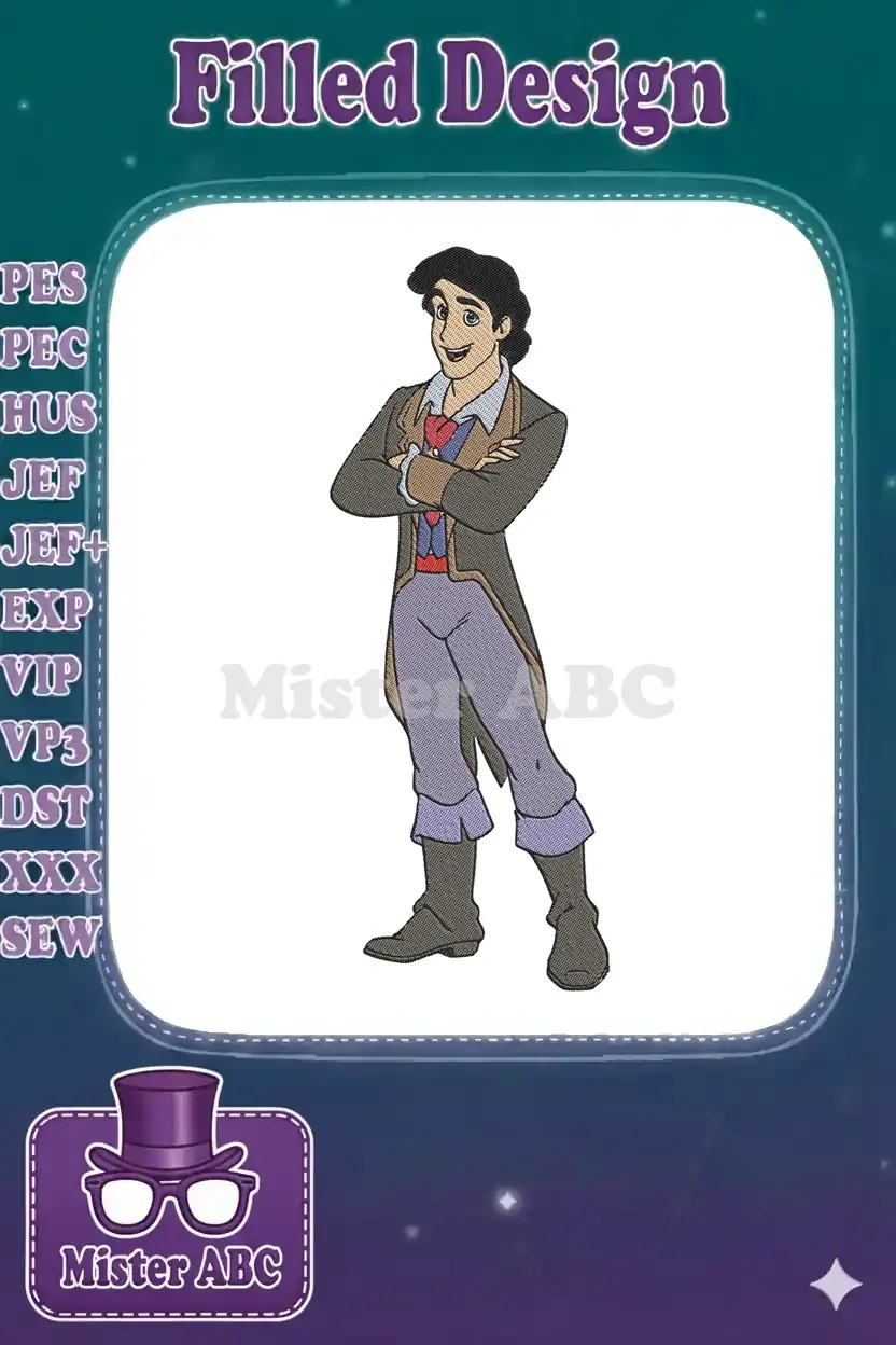 Prince Eric animated character embroidery designs for Disney enthusiasts