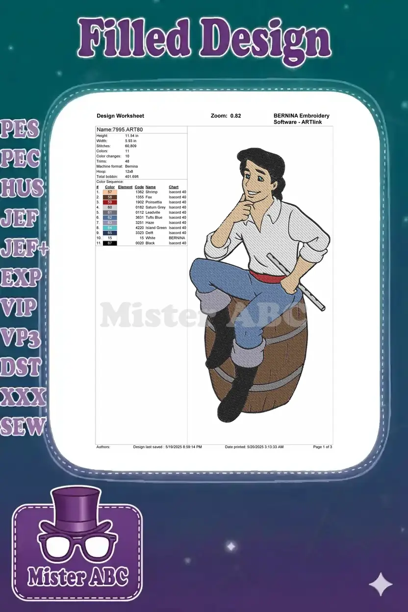 Prince Eric sitting on barrel cartoon embroidery designs