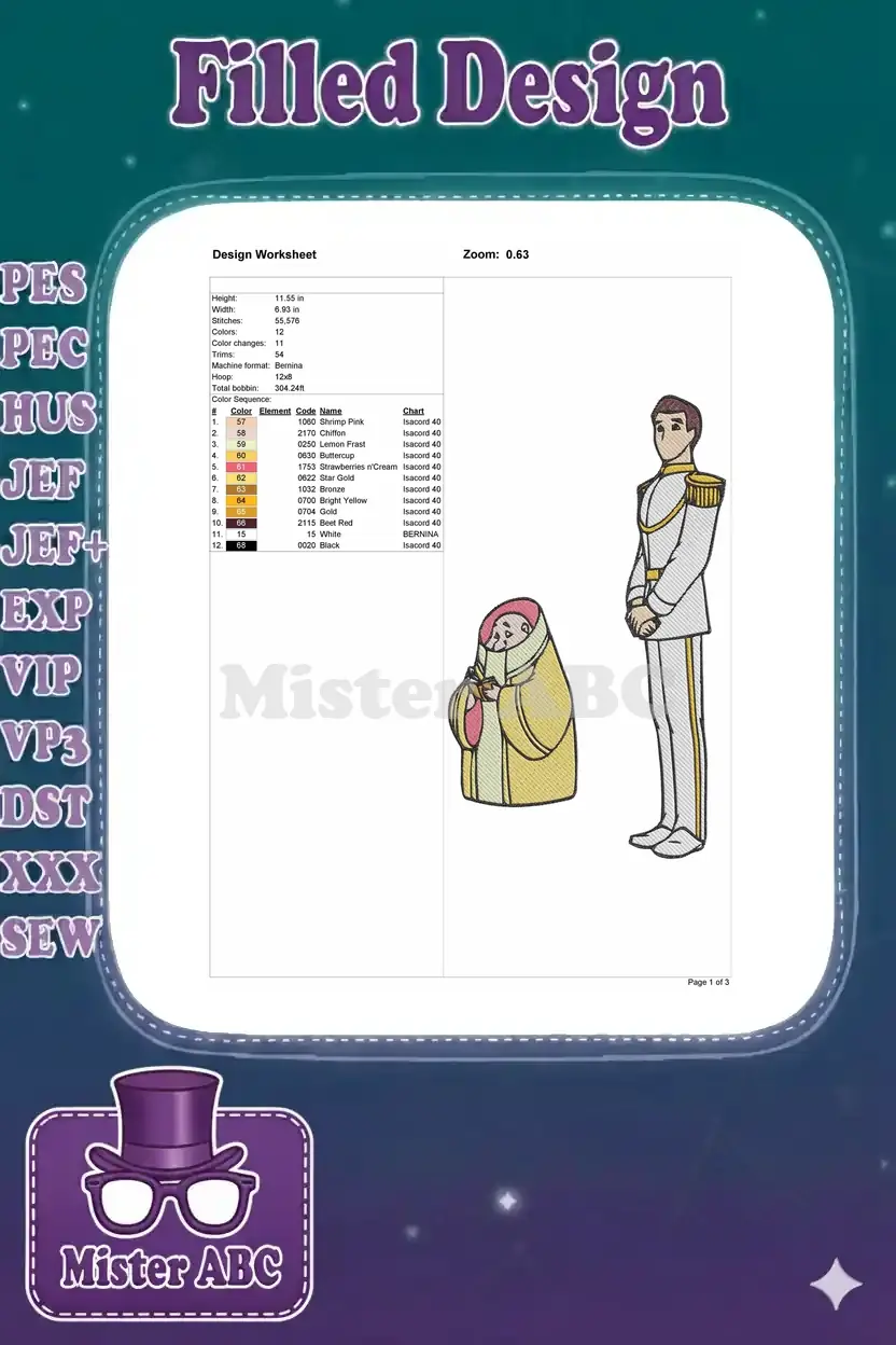 Charming embroidery of a regal prince and a wise elder, perfect for adding classic character flair to any textile.