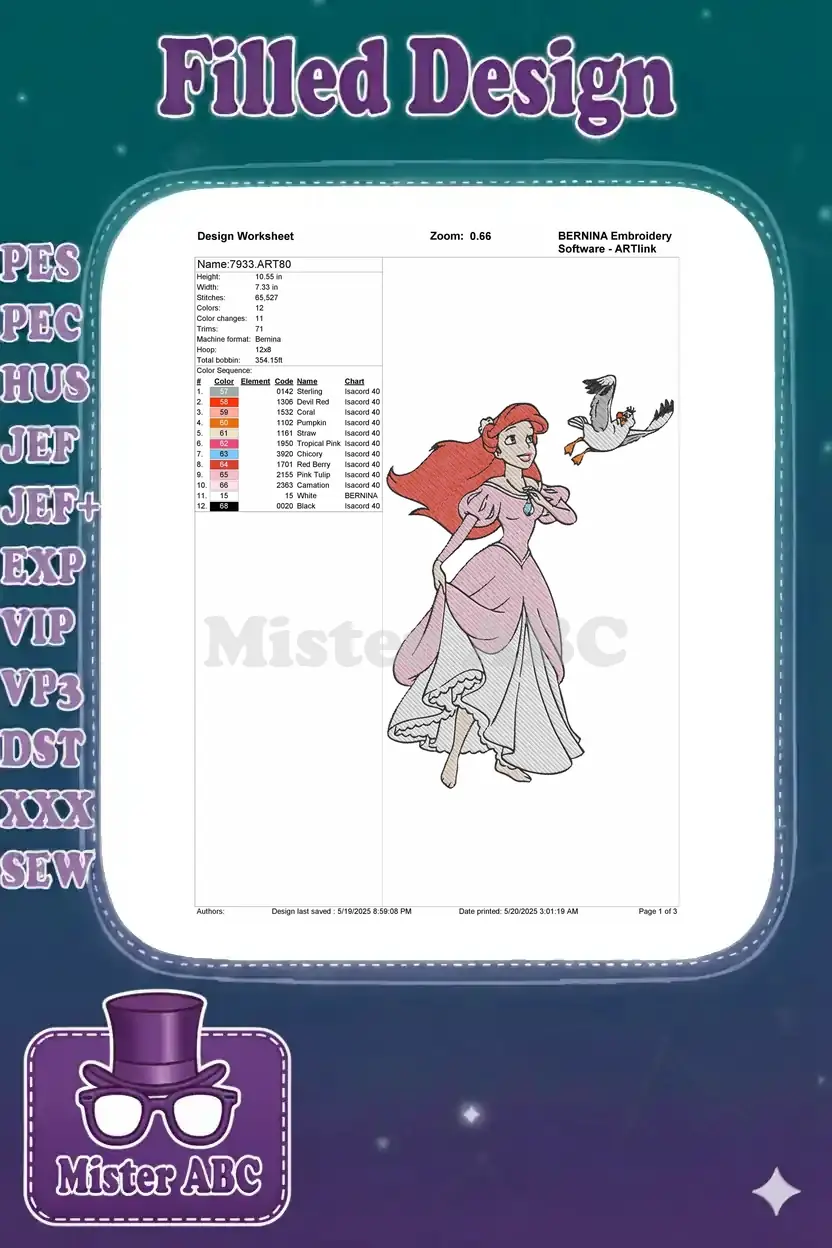 Princess Ariel in pink gown with Scuttle seagull embroidery designs