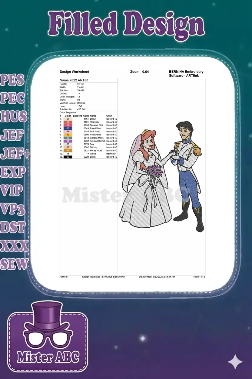 Princess Ariel Prince Eric Royal Wedding Embroidery Designs
