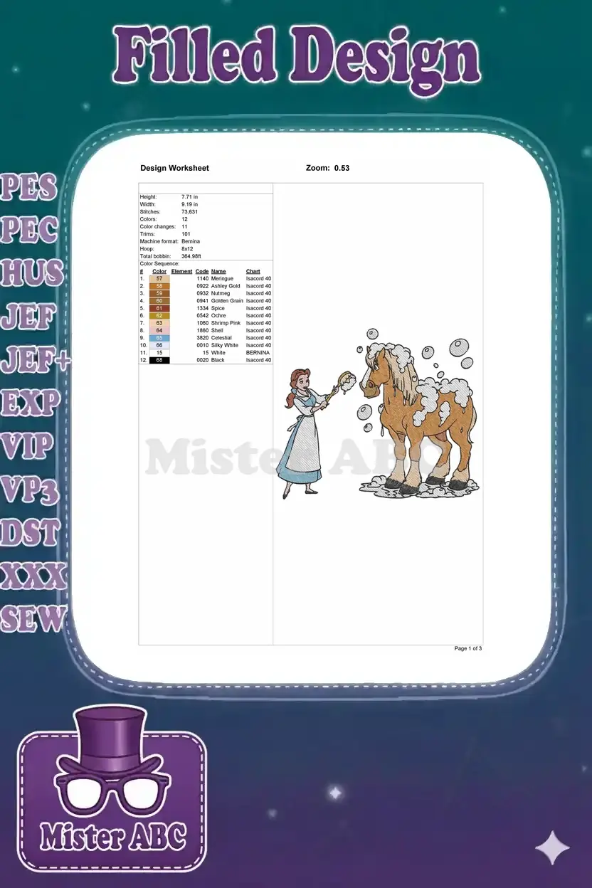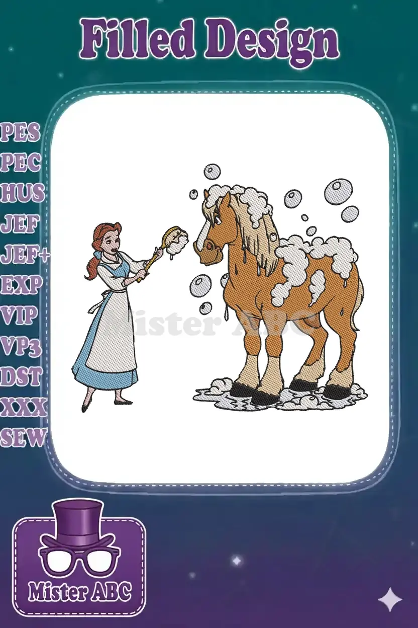 Princess Belle giving her horse a refreshing bubbly bath embroidery designs