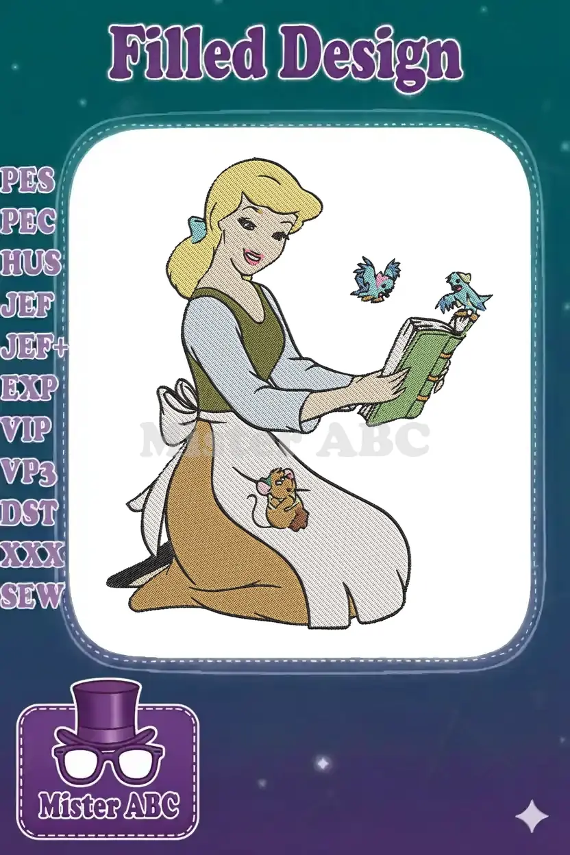 Princess Cinderella with Birds and Mouse Reading Book Embroidery Designs