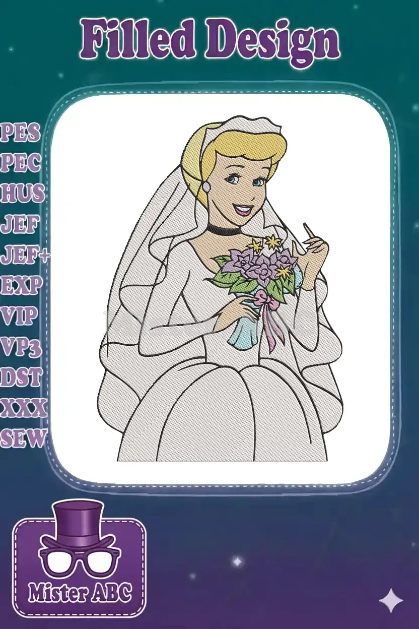 Embrace enchantment with this exquisite Cinderella bride embroidery design, perfect for fairytale projects and celebrations. Bring magical charm to any fabric.