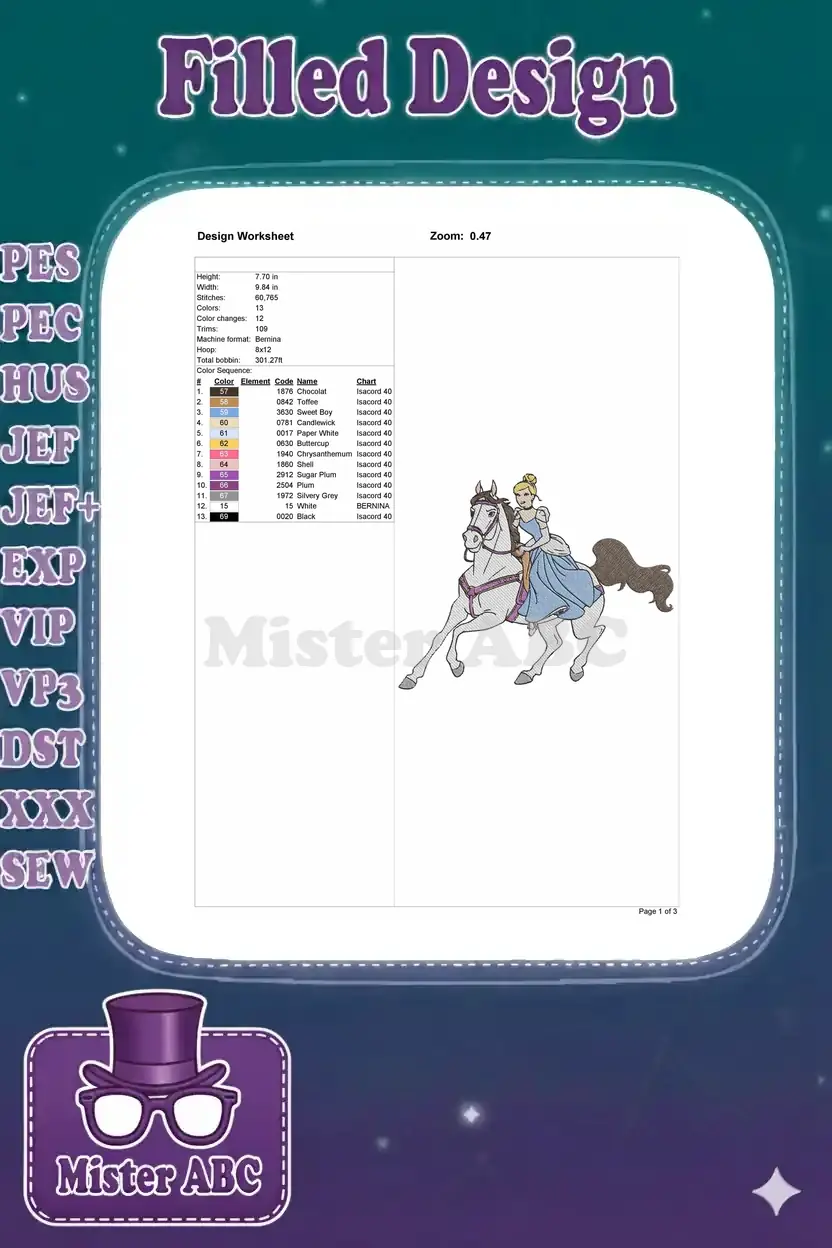 Princess Cinderella gracefully riding white horse blue ballgown embroidery designs